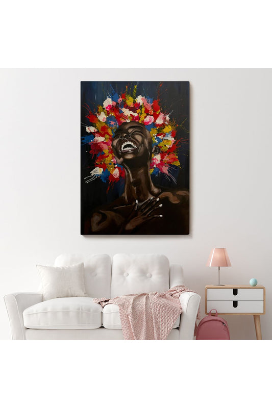 Yağlıboya Görünümlü Renkli Saçlı Gülen Siyahi Kadın Tablosu-6367
