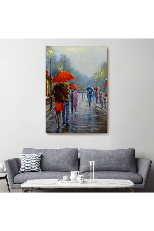 Yağmurda Yürüyen Romantik Çift Yağlıboya Görünüm Dekoratif Kanvas Duvar Tablosu-5943