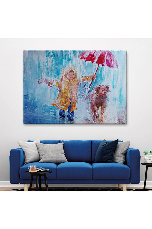 Yağmurda Köpeğini Gezdiren Cocuk Yağlıboya Görünümlü Kanvas Tablo-3454