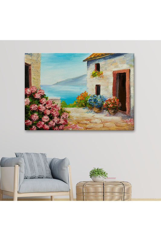 Çiçekler Arasındaki Deniz Manzaralı Ev Duvar Tablosu-3640