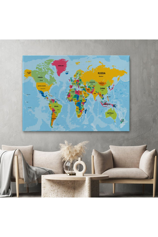 Dünya Haritası Ülke Başkentli Okyanuslu ve Dekoratif Kanvas Tablo 2243