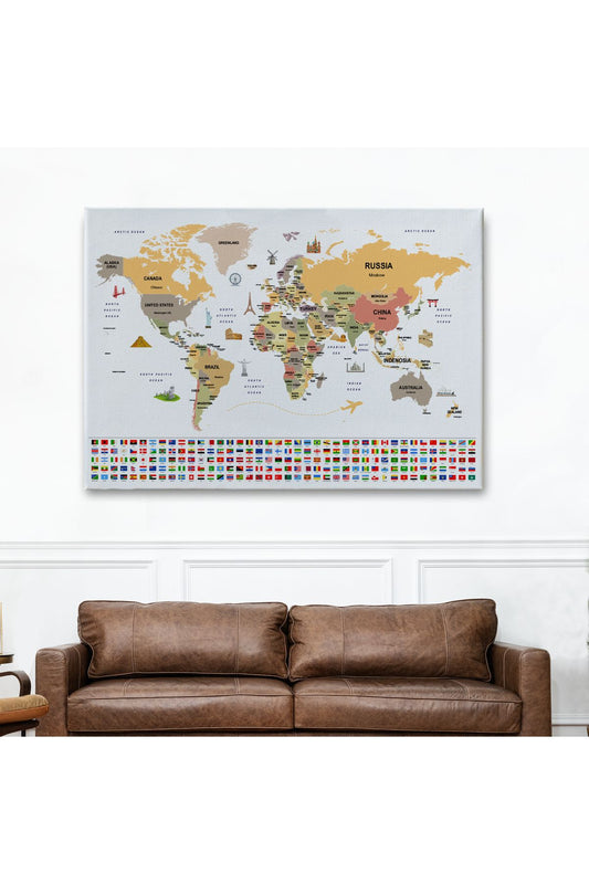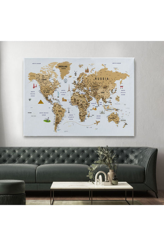 Dünya Haritası Son Derece Ayrıntılı Eğitici ve Sembollü Dekoratif Kanvas Tablo 3219