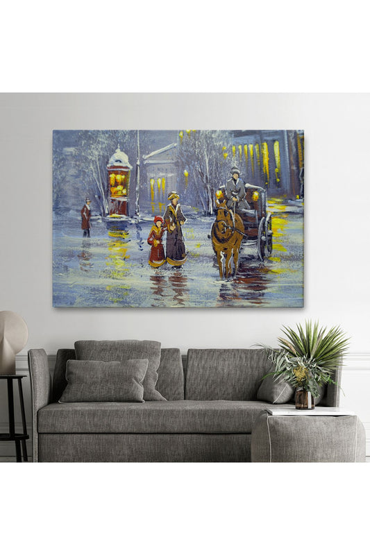 Eski Şehir ve At Arabası Yağlıboya Görünüm Dekoratif Kanvas Duvar Tablosu-3573