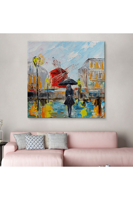 Paris de Yağmur da Yürüyen Kadın Yağlıboya Görünüm Dekoratif Kanvas Duvar Tablosu-5844