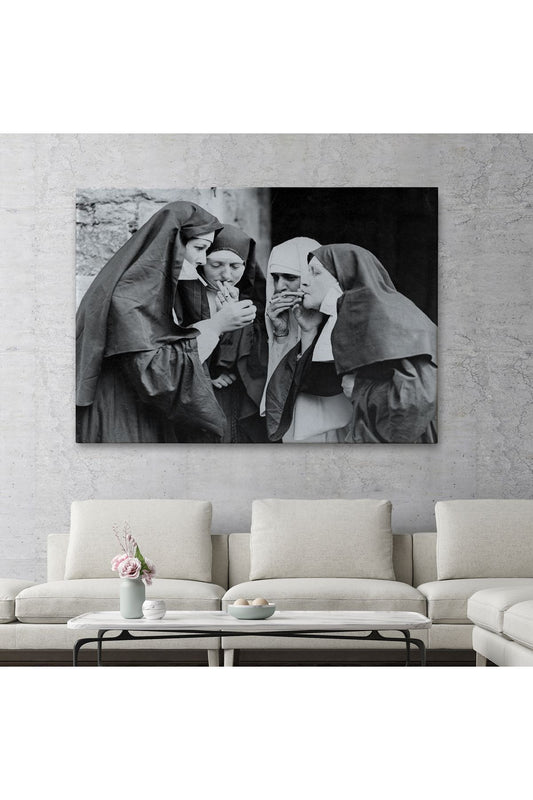 Sigara İçen Rahibeler Vintage Fotoğraf Tablo, Siyah ve Beyaz Kanvas Tablo-5376