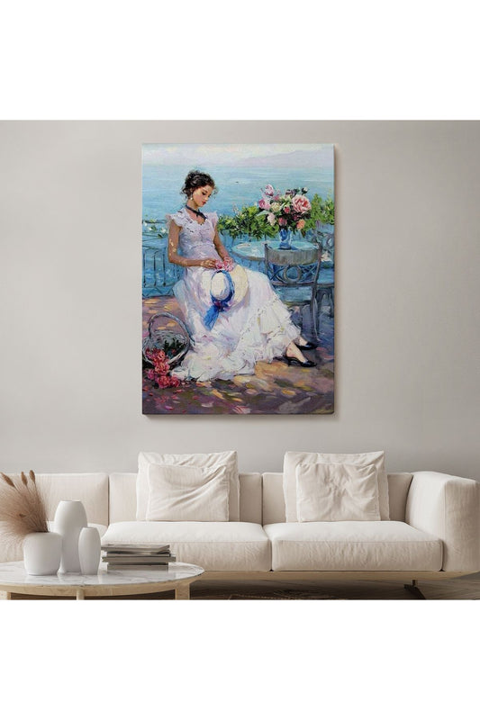 Terastaki Beyaz Elbiseli Güzel Kadın Tablosu-6273