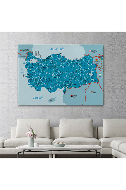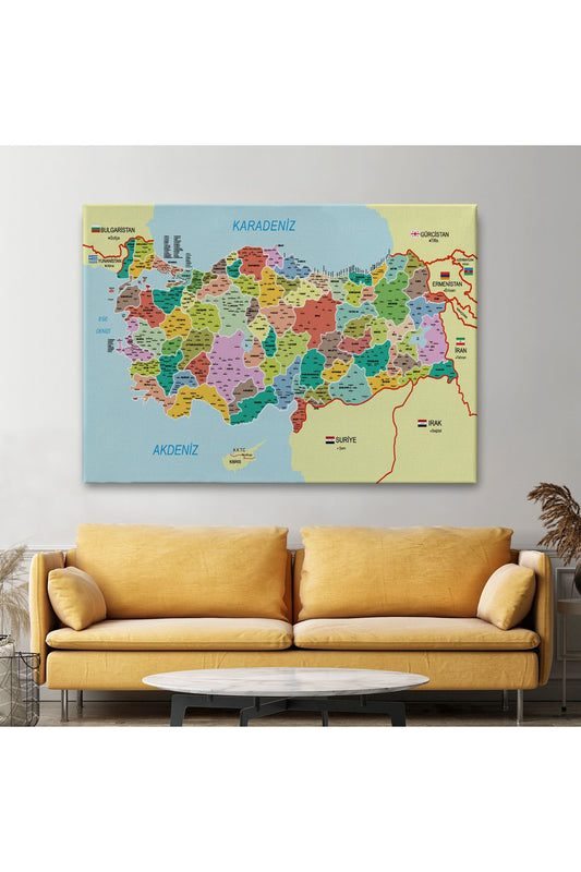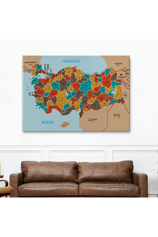Türkiye Haritası Kanvas Tablo Sınır Komşulu Eğitici Dekoratif Tablo 3096