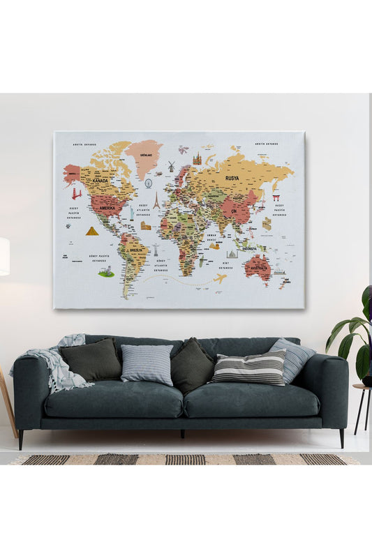 Türkçe Dünya Haritası Son Derece Ayrıntılı Eğitici ve Sembollü Kanvas Tablo 3206