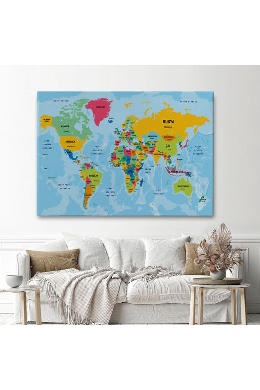 Türkçe Dünya Haritası Ülke Başkentli ve Okyanuslu Dekoratif Kanvas Tablo 2228
