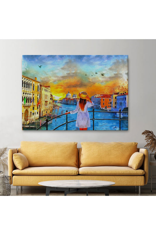 Venedik Kanalını İzleyen Kız Yağlıboya Görünüm Dekoratif Kanvas Duvar Tablosu-3699