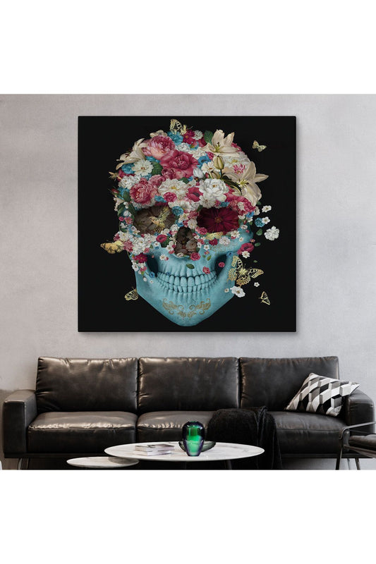 Renkli Çiçeklerle Kafatası Kanvas Tablo, Ölülerin Günü Baskıları, Şeker Kafatası-5332