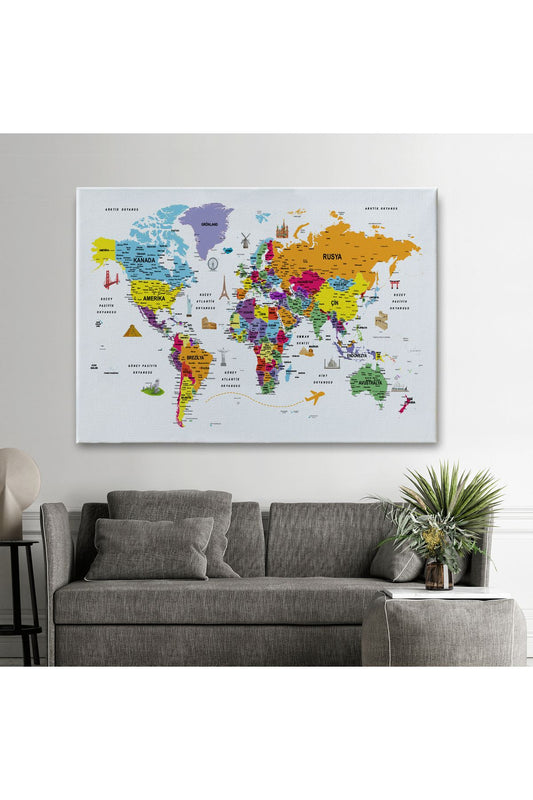 HG Türkçe Dünya Haritası Son Derece Ayrıntılı Eğitici ve Sembollü Kanvas Tablo 3180