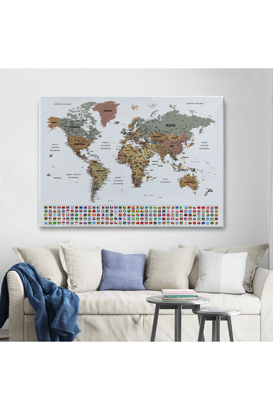 Türkçe Dünya Haritası Son Derece Ayrıntılı Eğitici ve Bayraklı Kanvas Tablo 2809