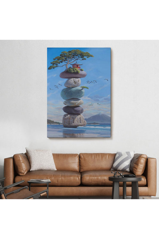Sahilde Renkli Denge Taşları, Meditasyon, Yoga, Spiritüel Baskı Kanvas Tablo-5239