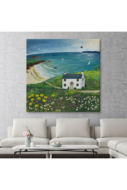 İngiltere Sahilindeki Beyaz Külübe, Martılar ve Çiçekler Kanvas Tablo-5852