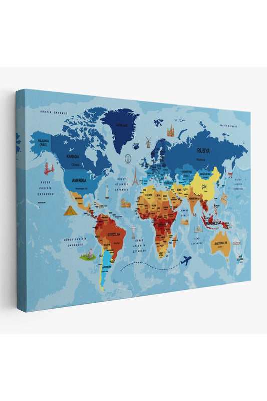 Türkçe Dünya Haritası Sembollü ve Okyanuslu Dekoratif Kanvas Tablo 2422