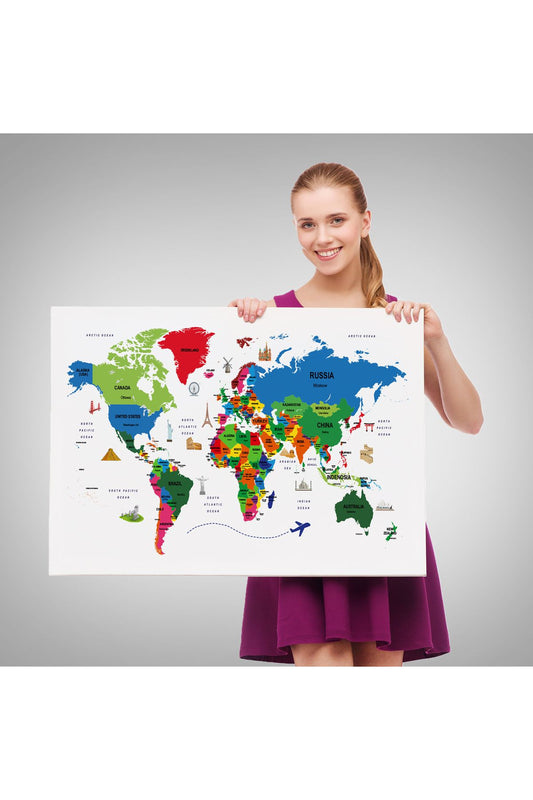 Dünya Haritası Dekoratif Kanvas Tablo Ülke ve Başkentli Öğretici ve Sembollü 2331