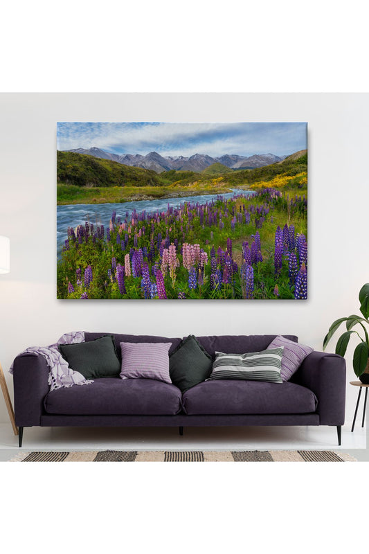 Nehir Dağ ve Mor Acı Bakla Çiçekleri Manzarası Duvar Tablosu-3759