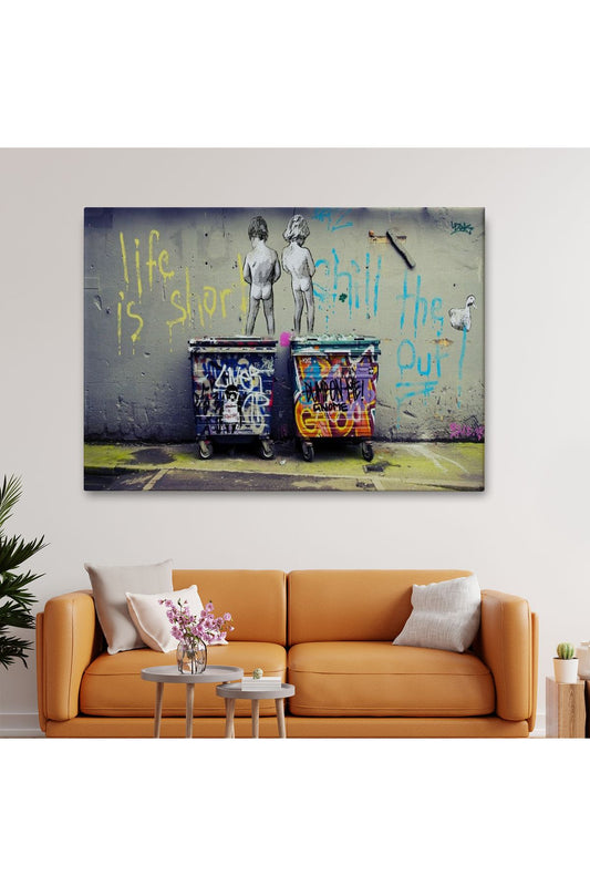 modagos068 Bansky Çöp Kutusuna İşeyen Çocuklar Kanvas Tablosu / Hayat Kısa-5154