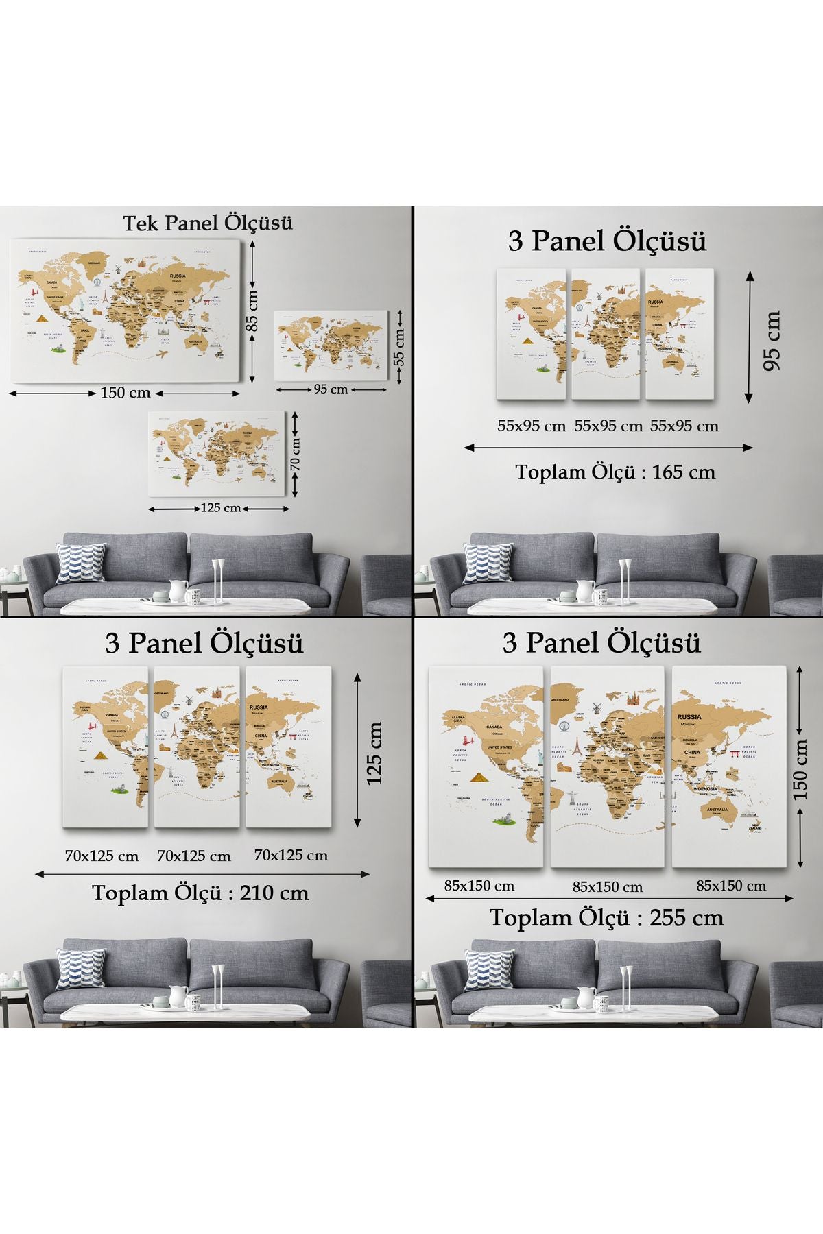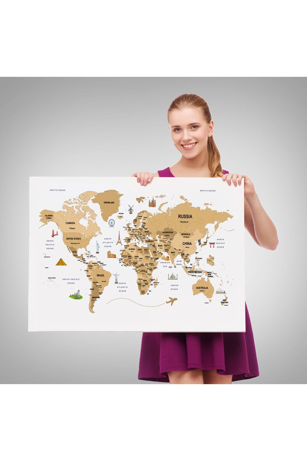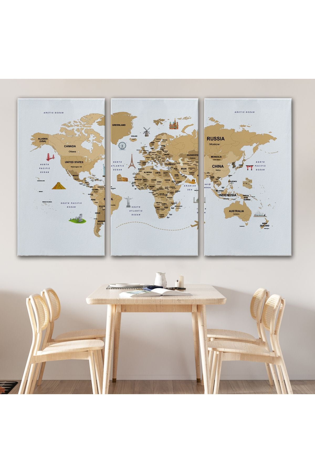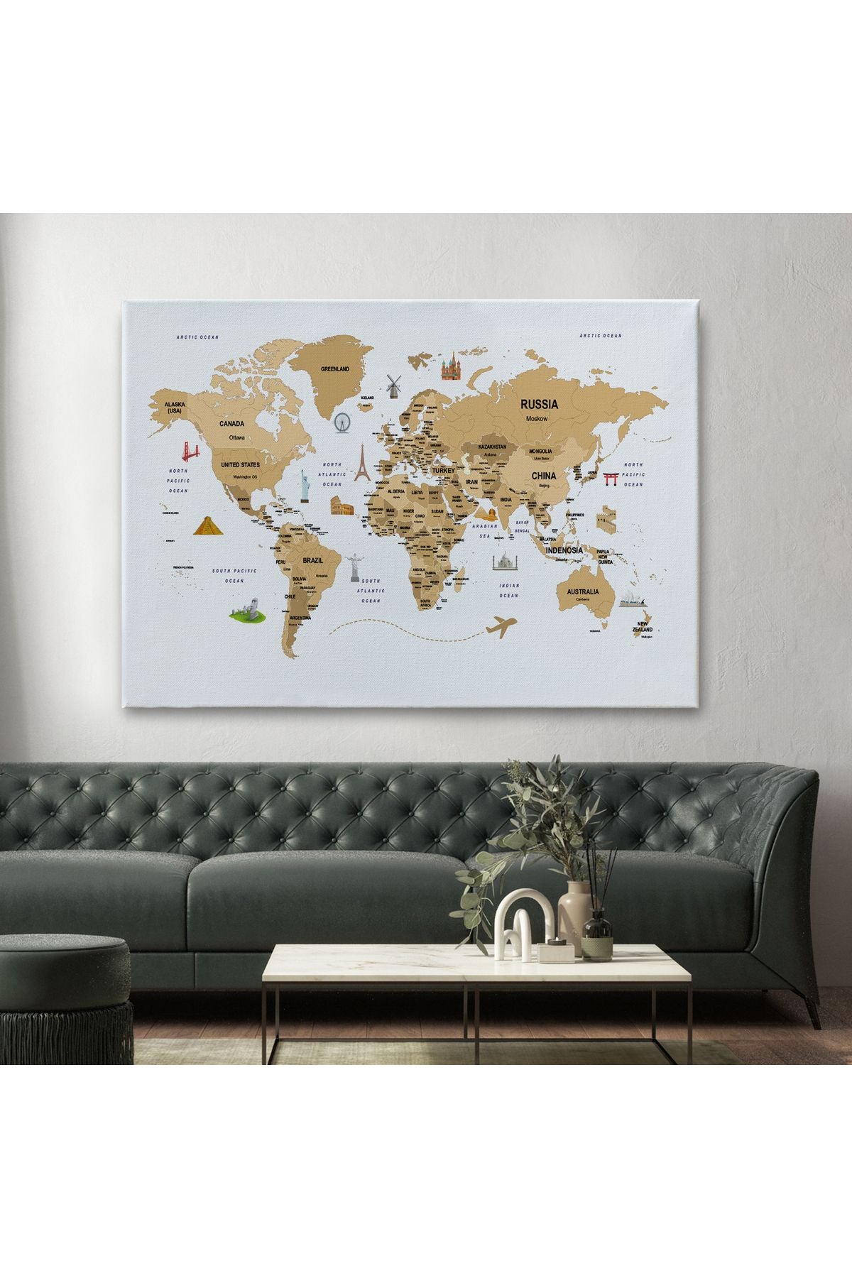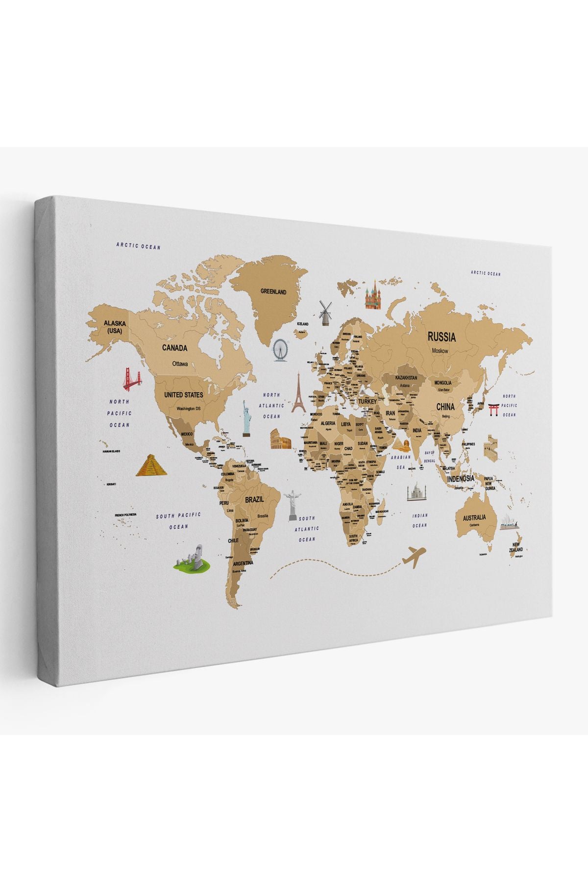 Dünya Haritası Dekoratif Kanvas Tablo Ülke ve Başkentli Öğretici ve Sembollü 2323