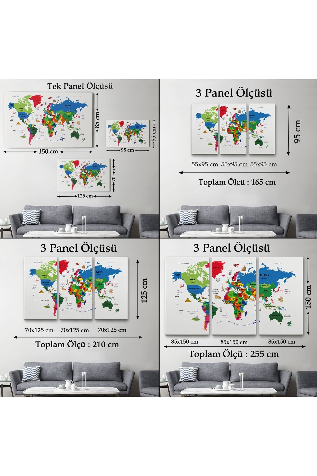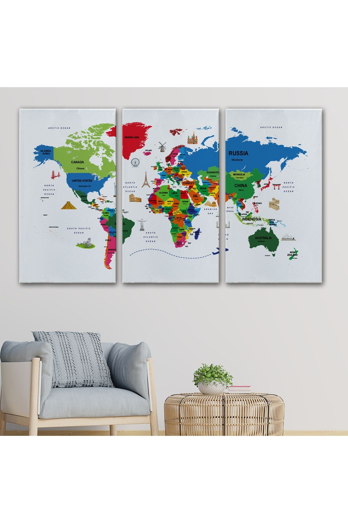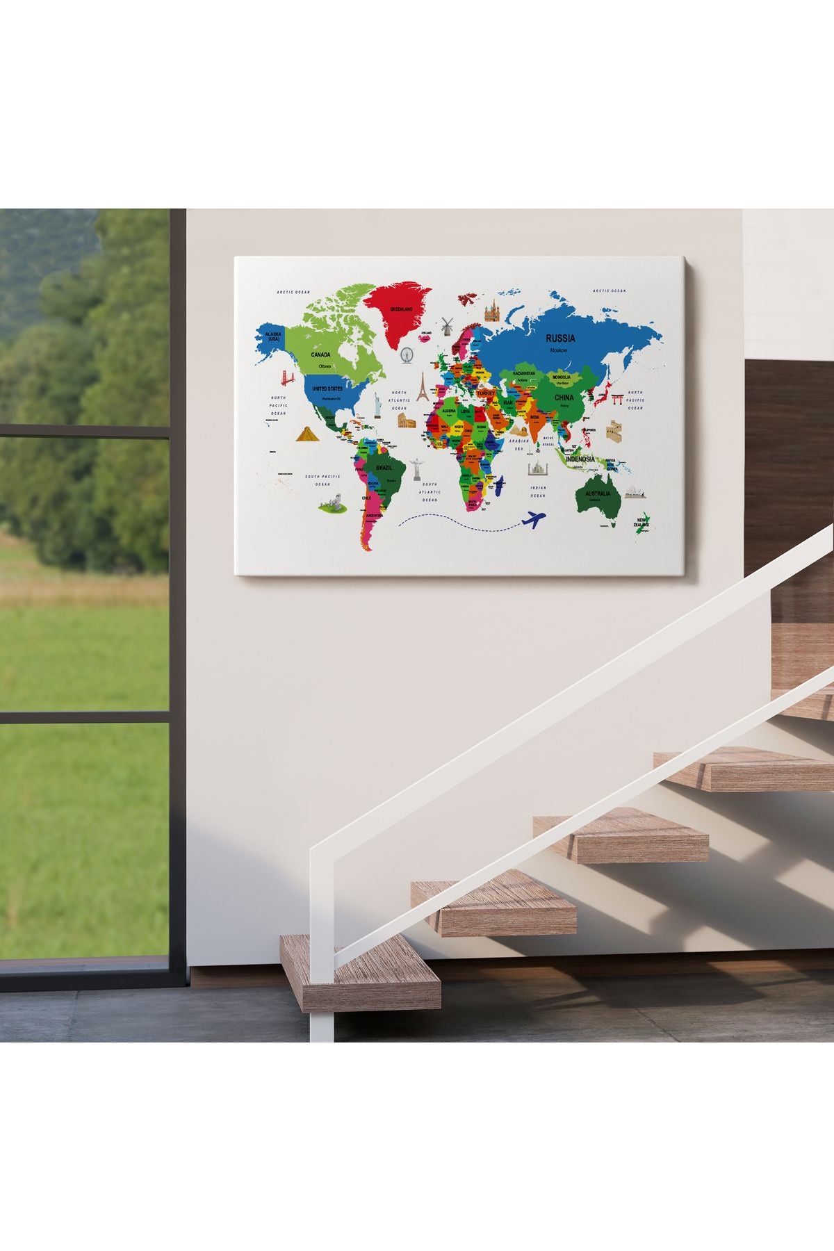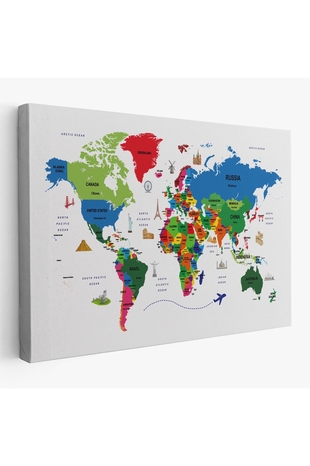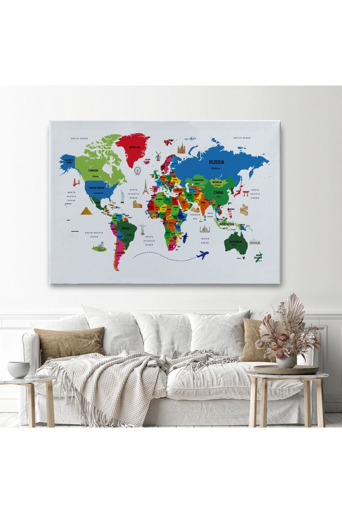 Dünya Haritası Dekoratif Kanvas Tablo Ülke ve Başkentli Öğretici ve Sembollü 2331