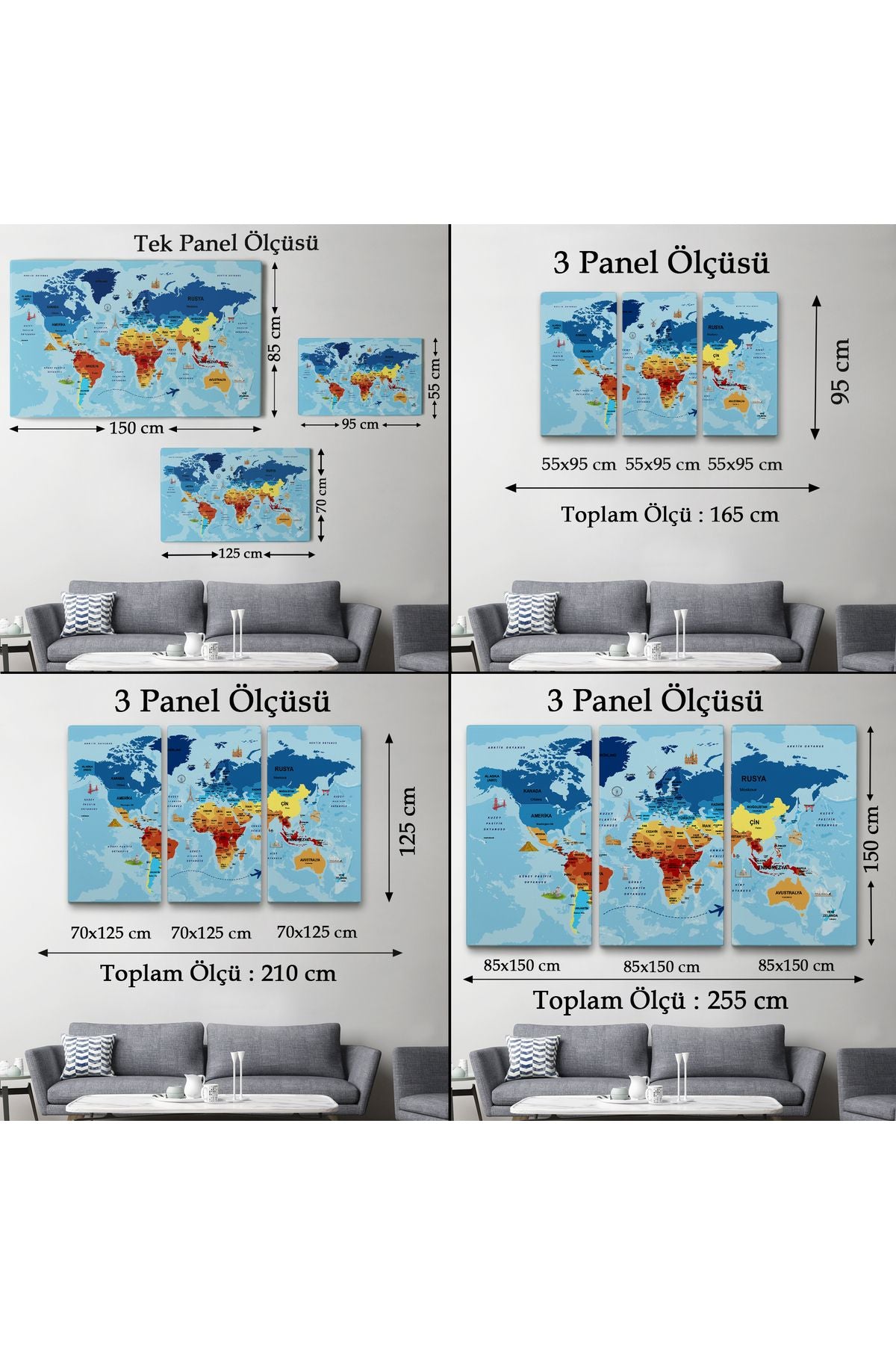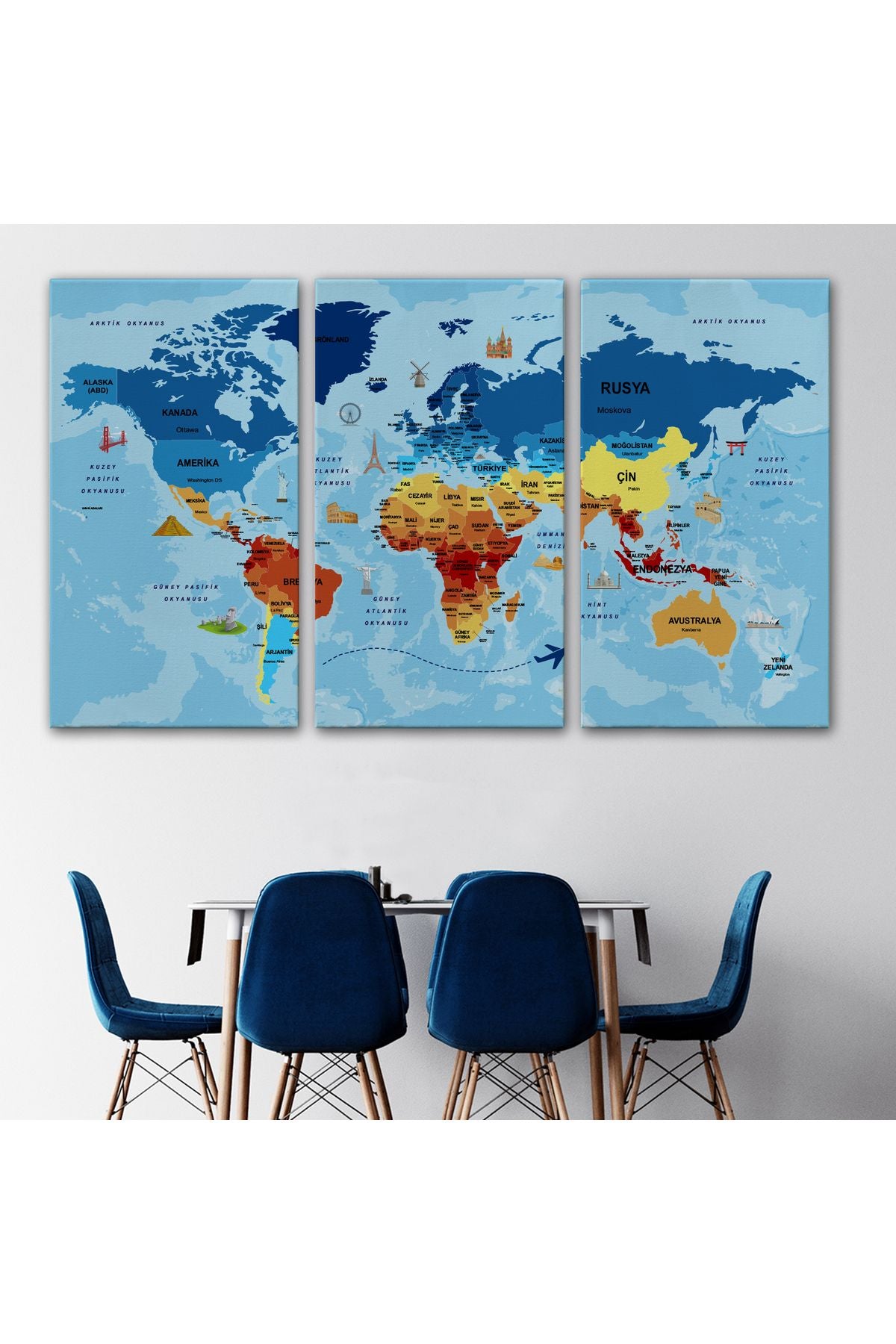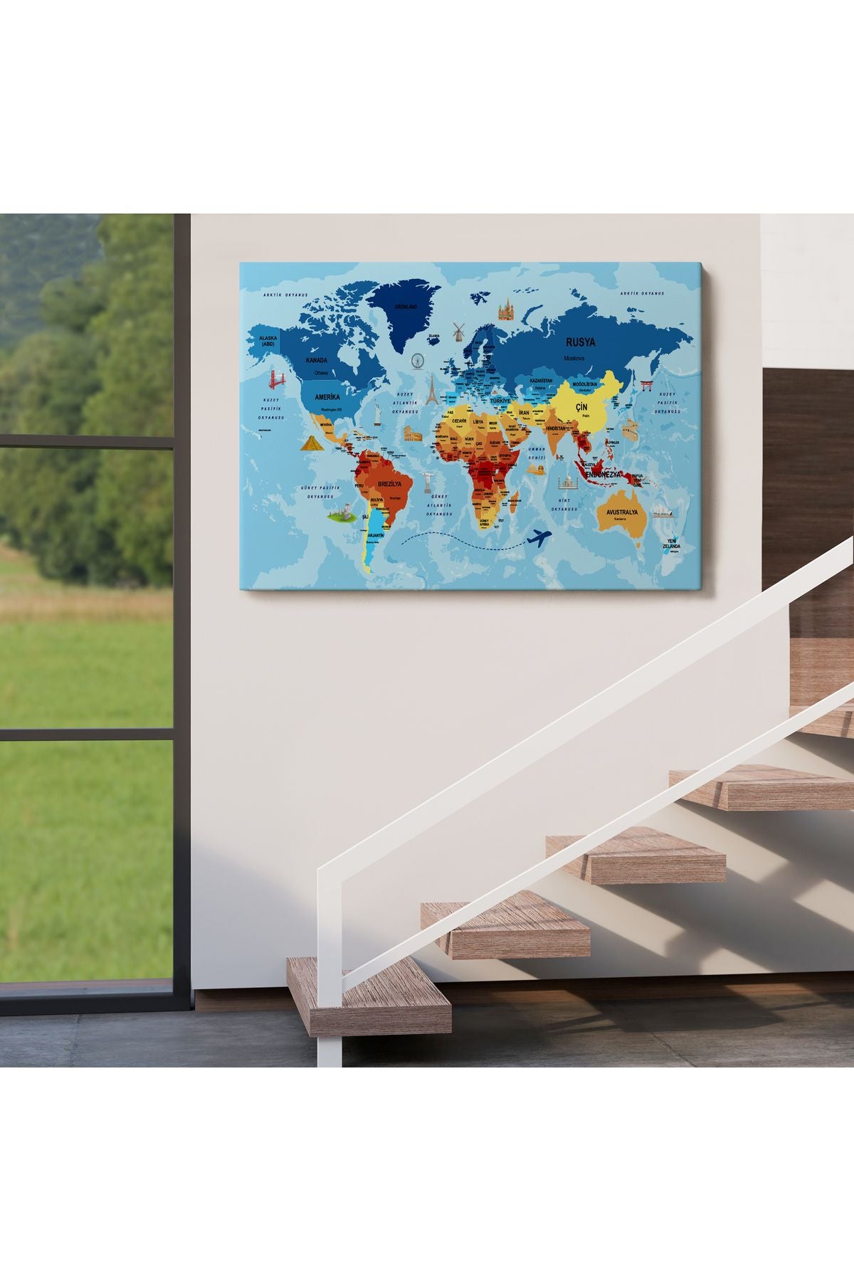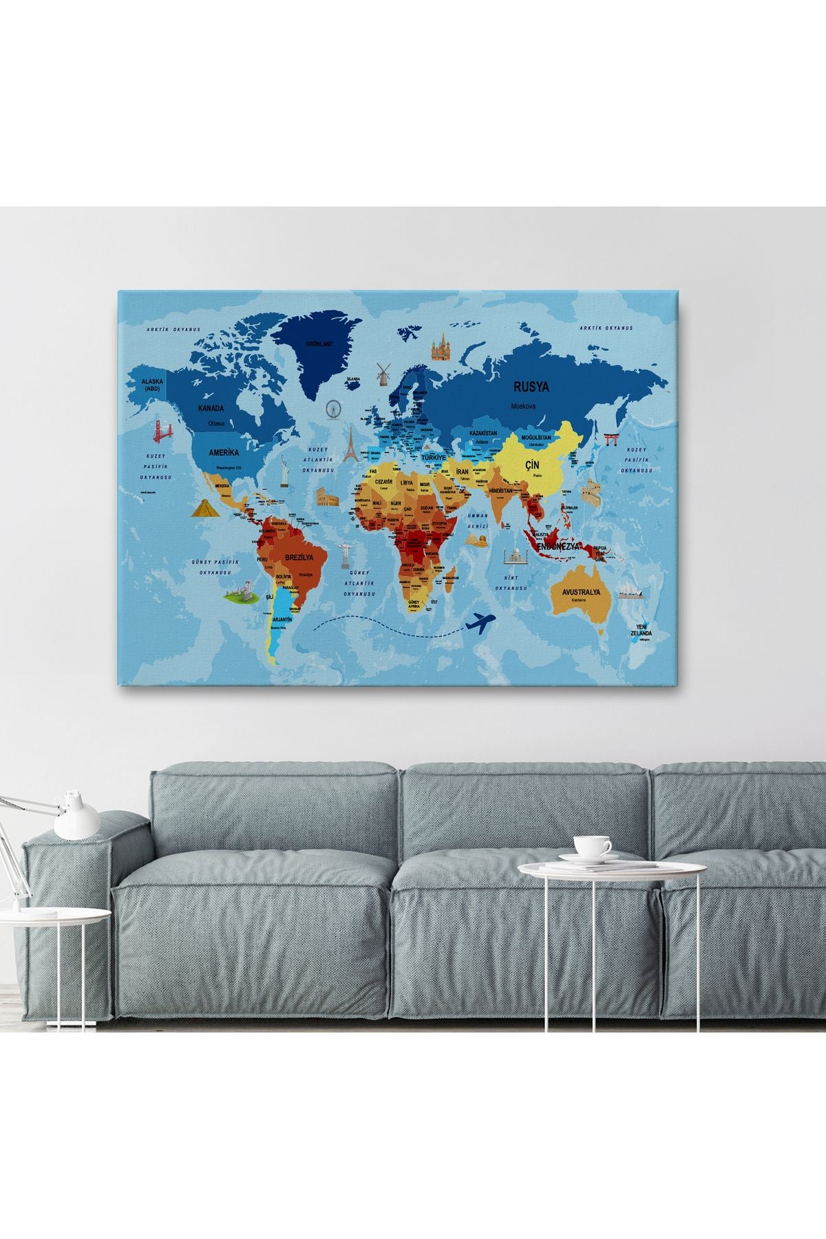 Türkçe Dünya Haritası Sembollü ve Okyanuslu Dekoratif Kanvas Tablo 2422