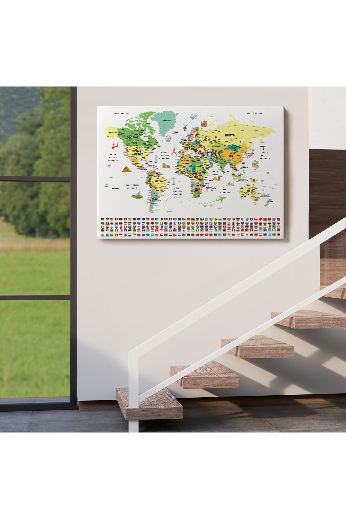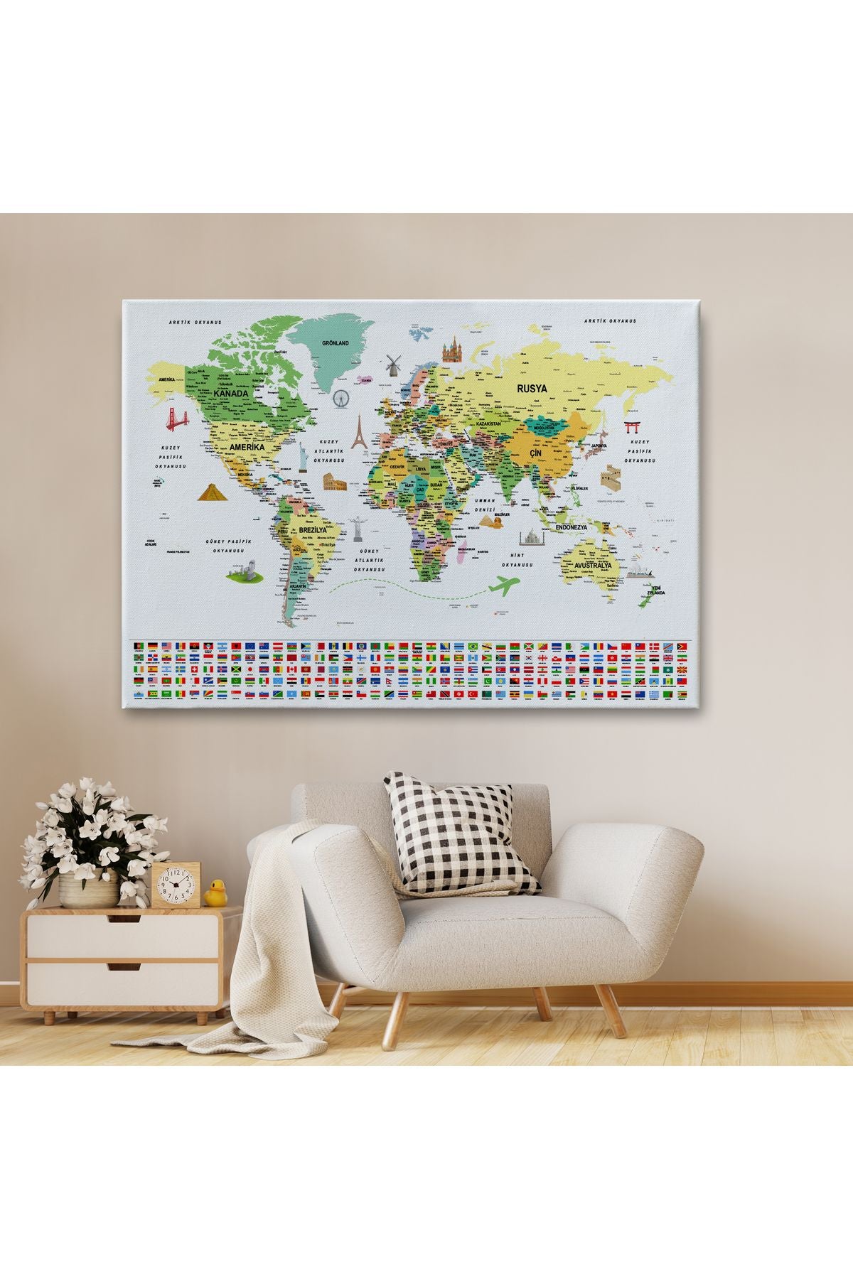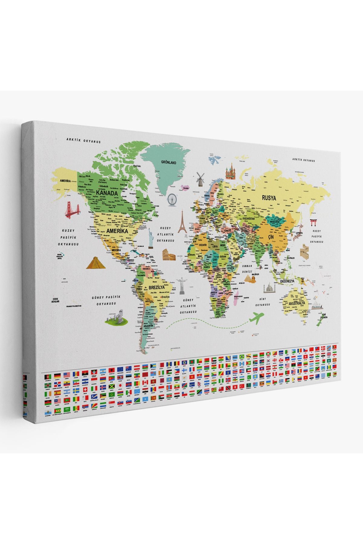 arg001 seri Türkçe Dünya Haritası Ayrıntılı Eğitici Sembollü Bayraklı Dekoratif Kanvas Tablo 2848