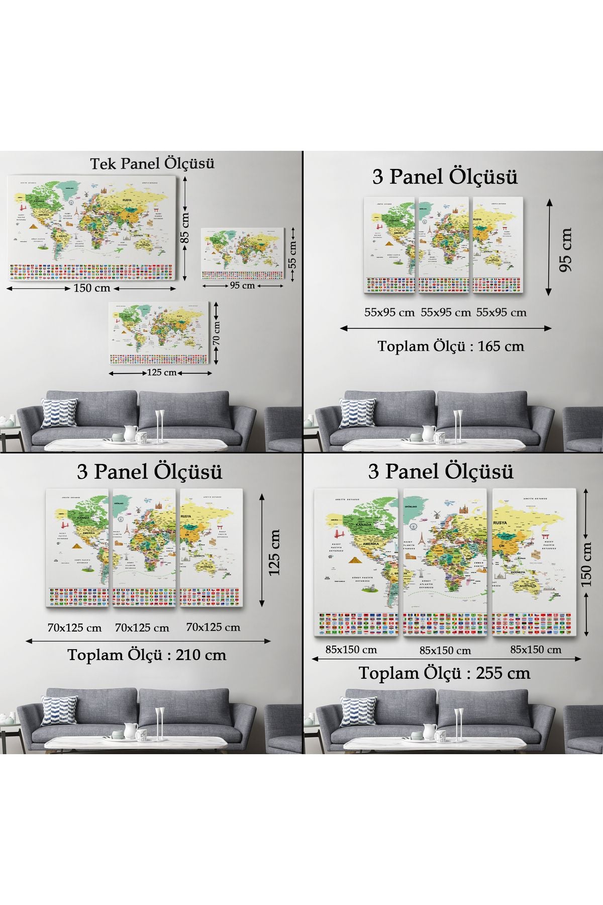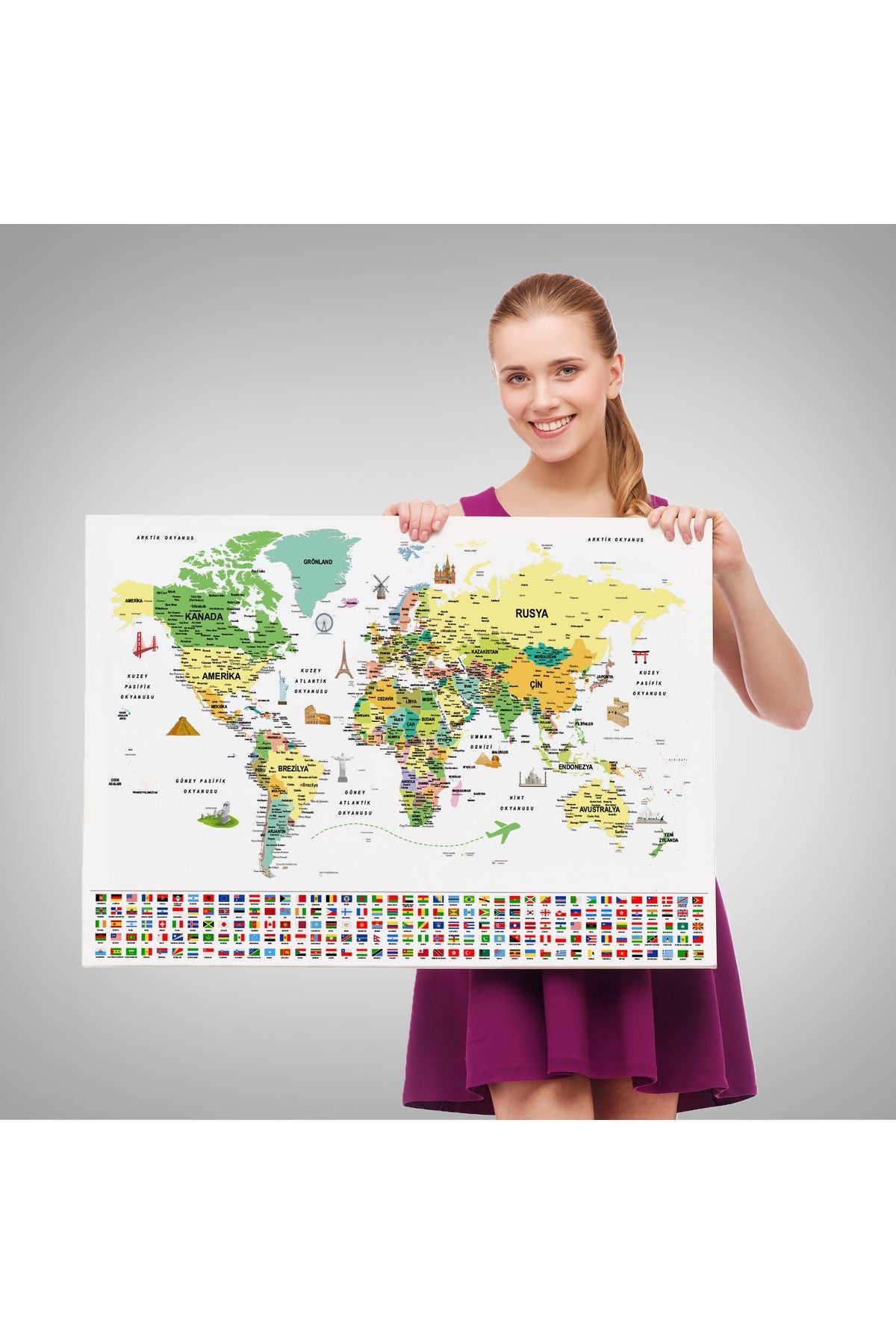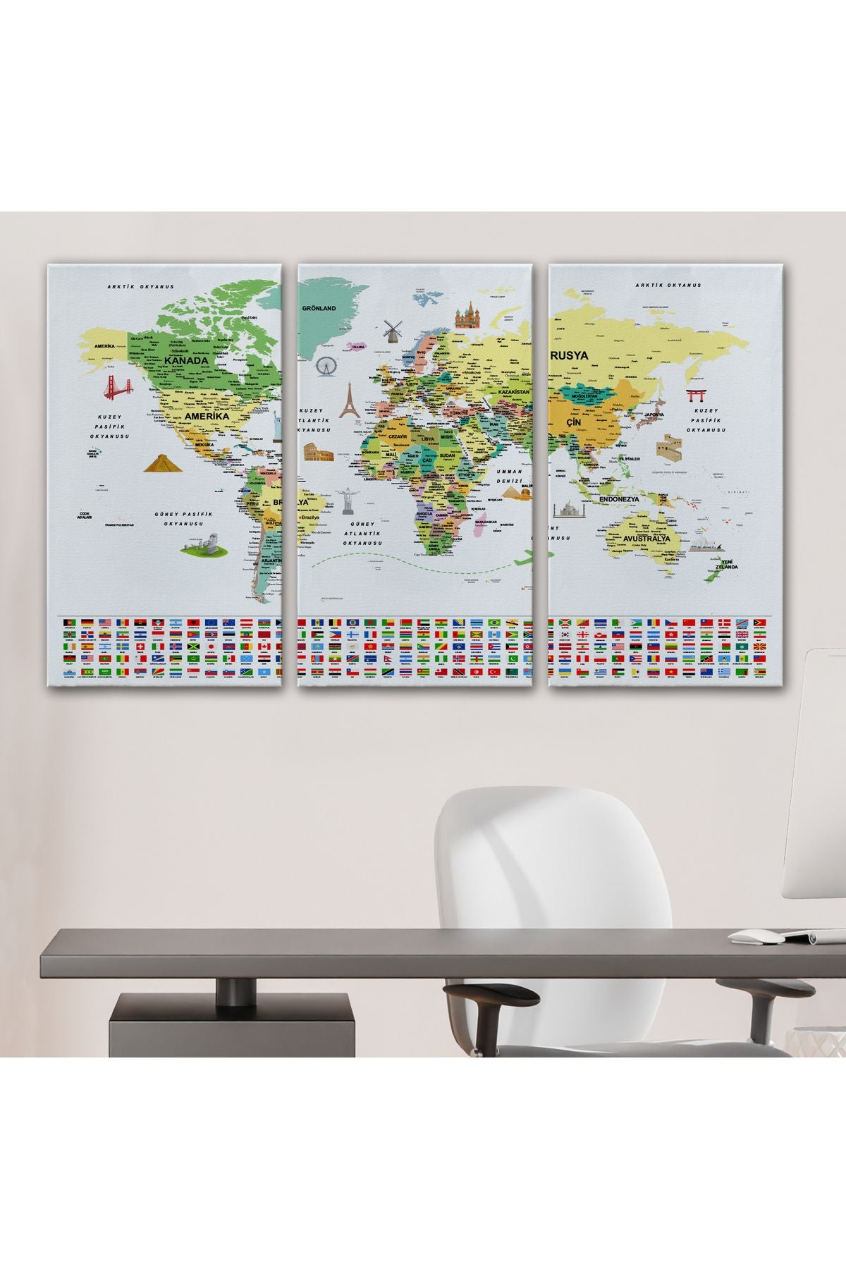 arg001 seri Türkçe Dünya Haritası Ayrıntılı Eğitici Sembollü Bayraklı Dekoratif Kanvas Tablo 2848
