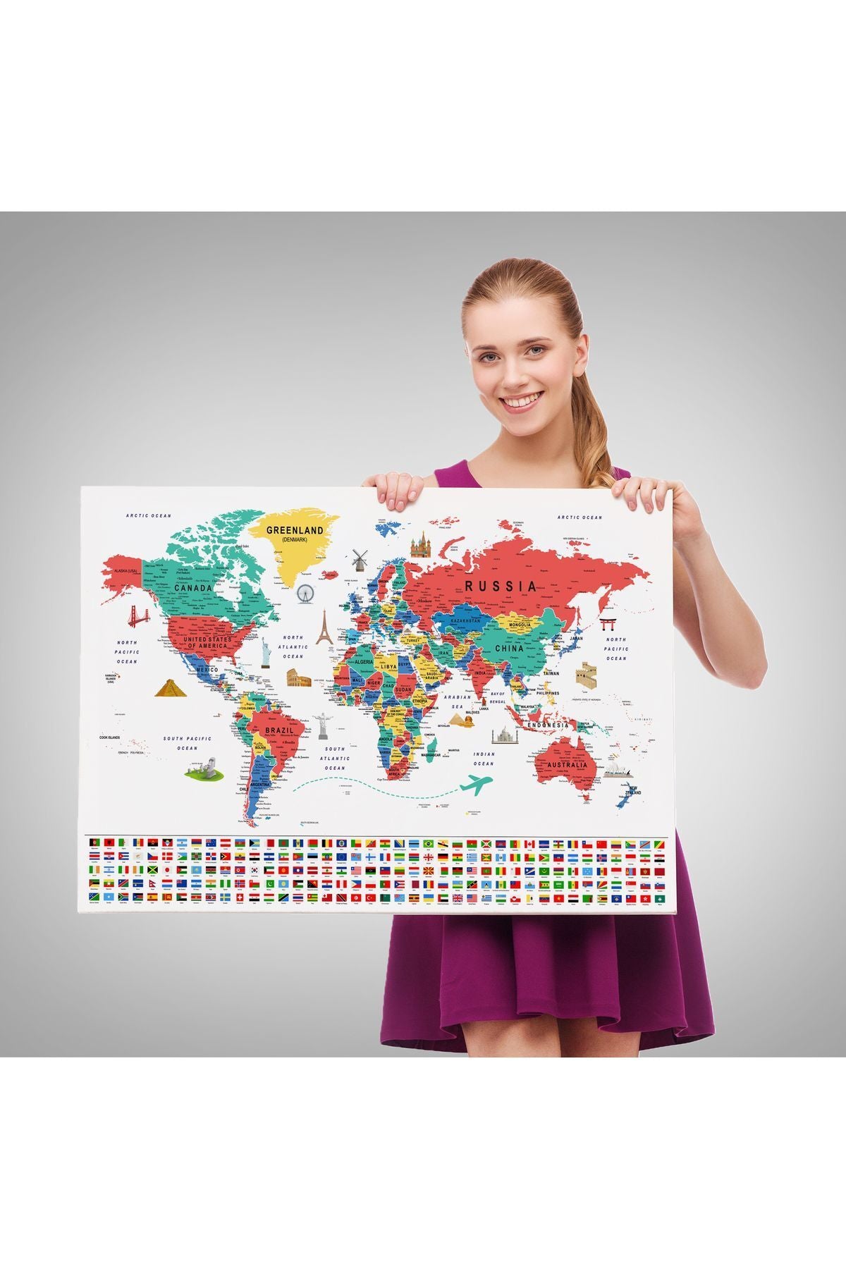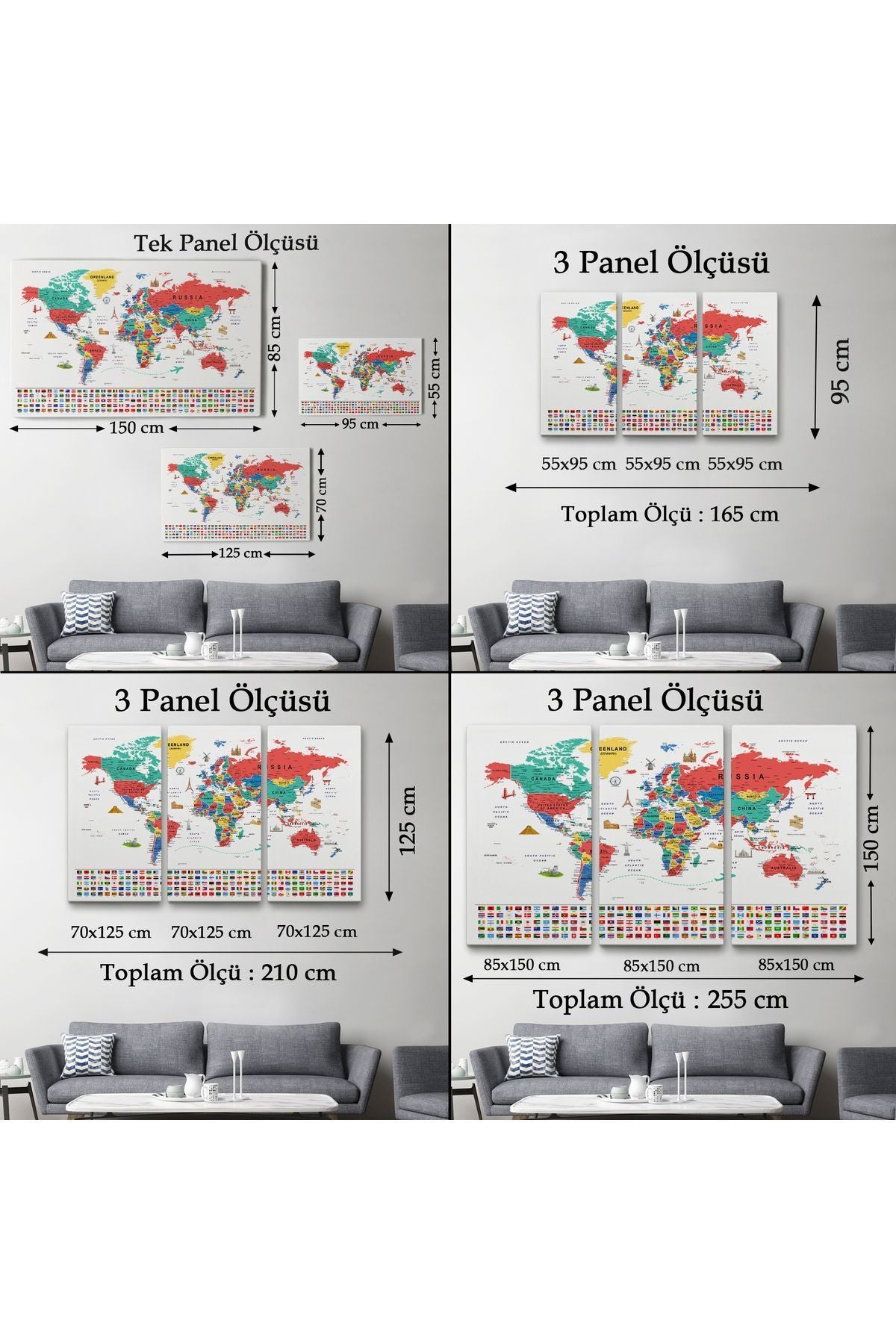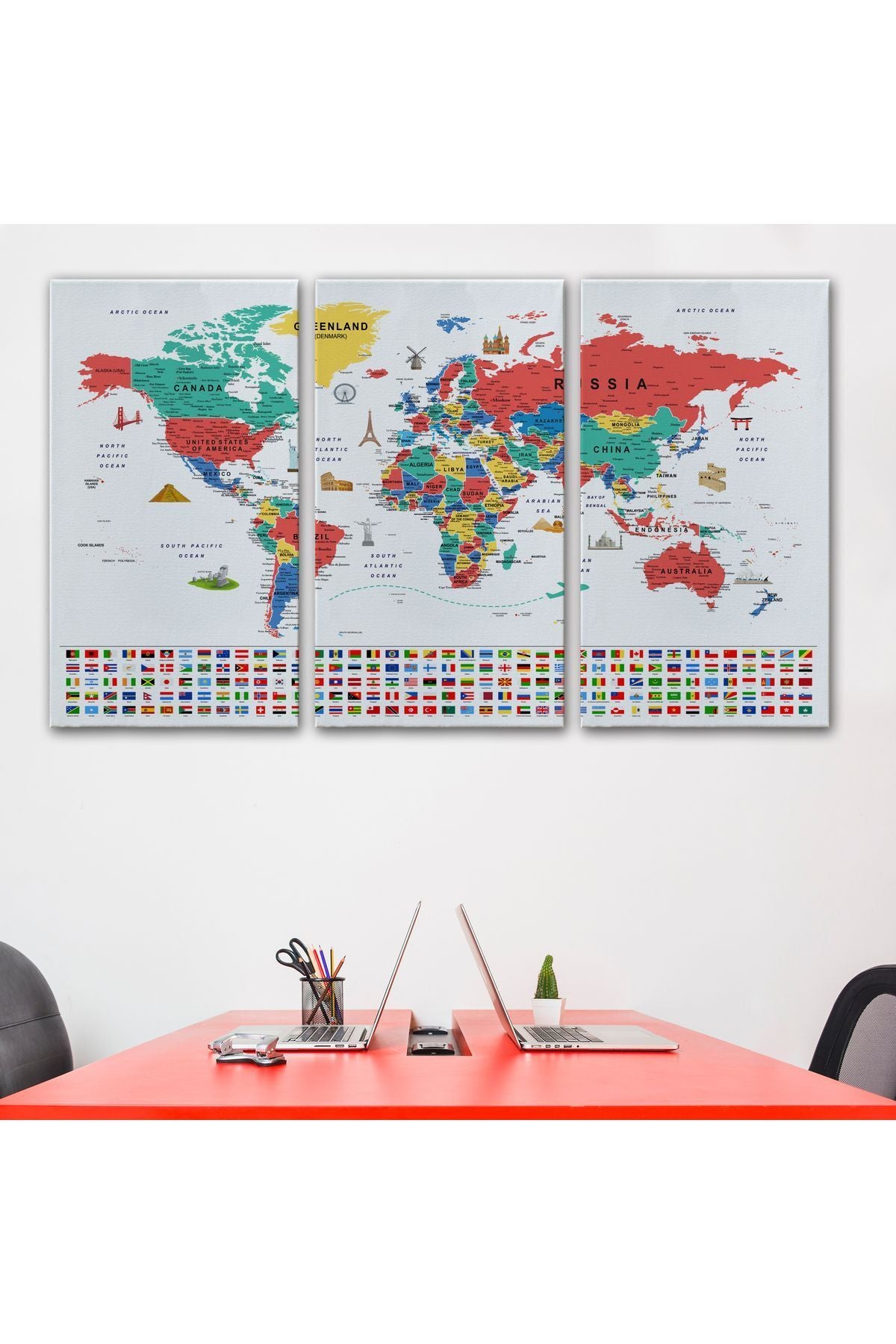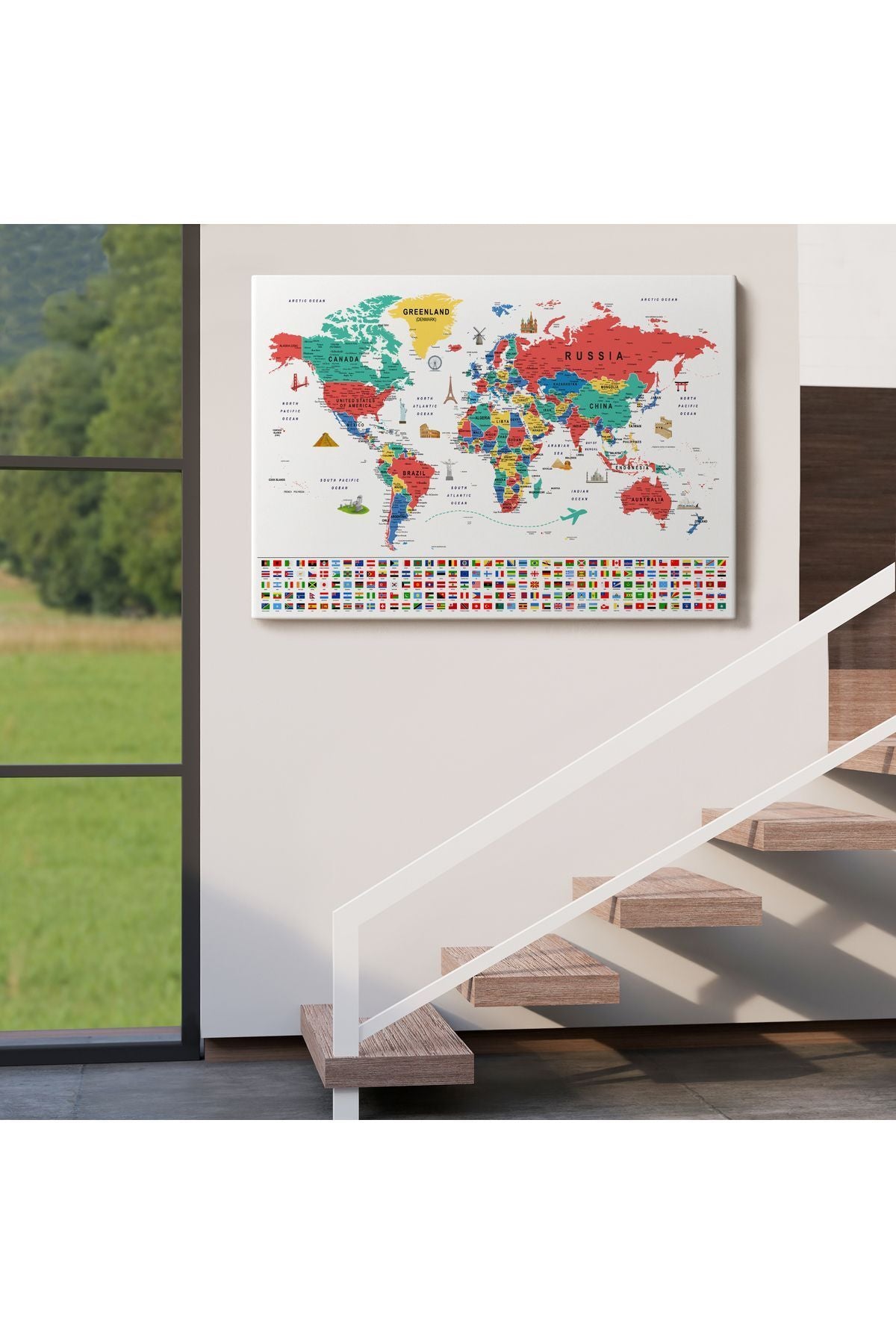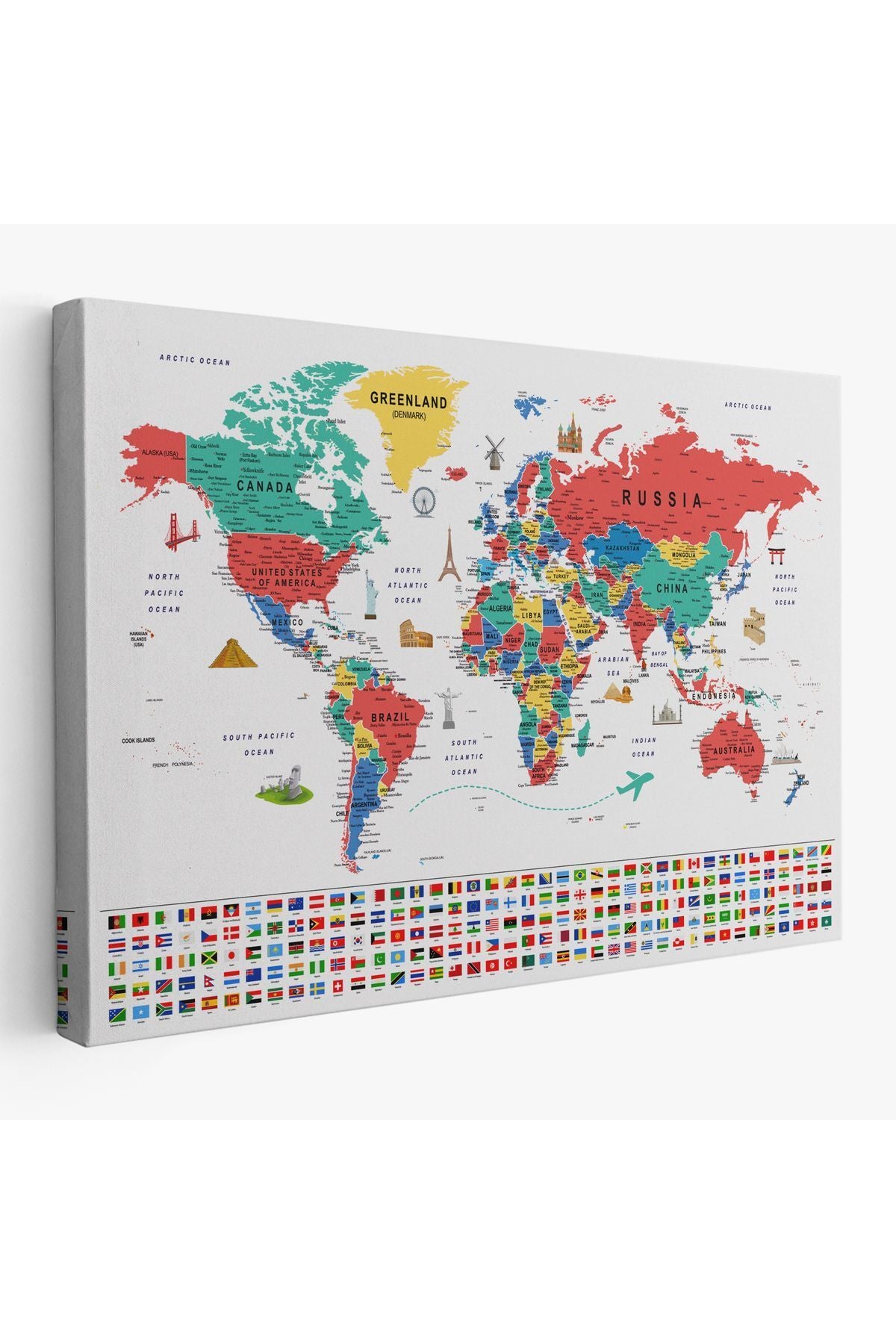 Dünya Haritası Ayrıntılı Eğitici Sembollü Bayraklı Dekoratif Kanvas Tablo 2865