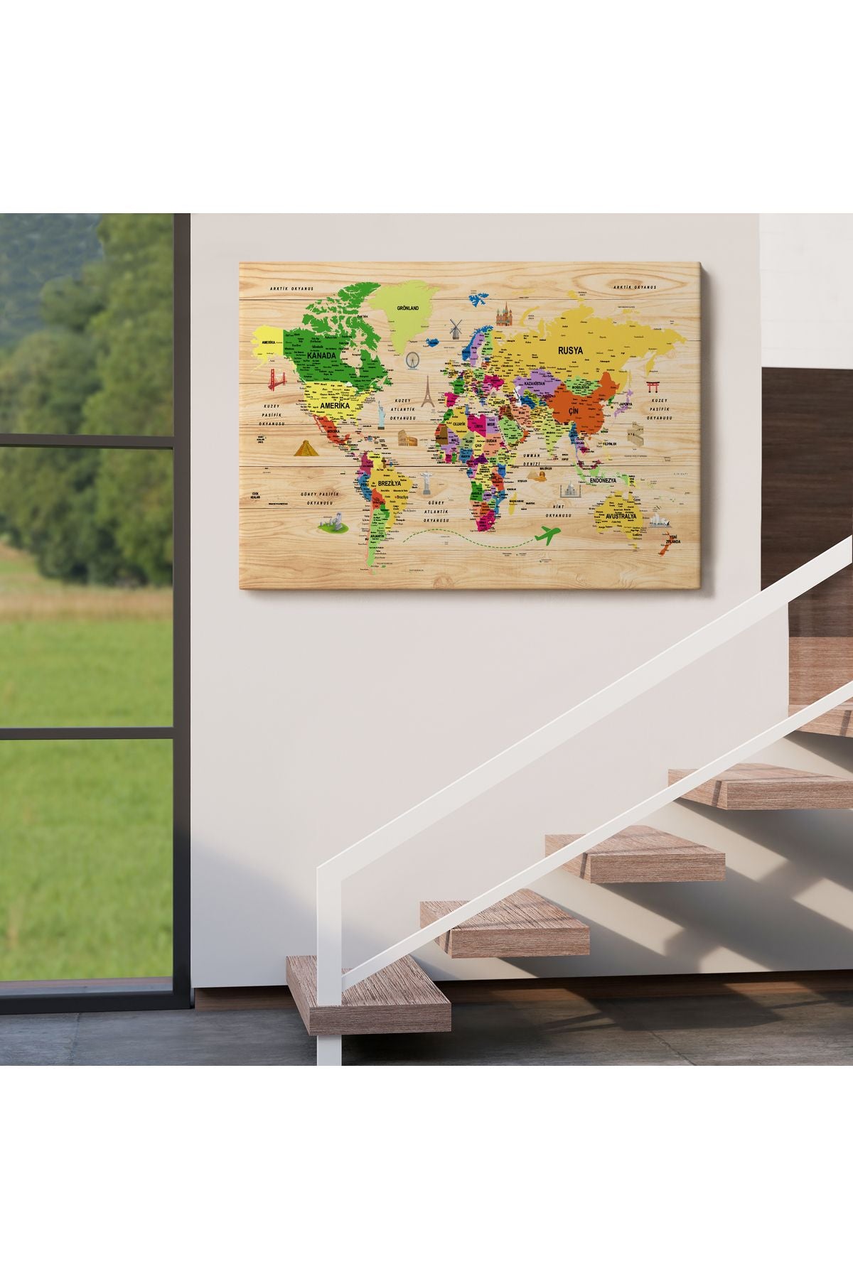DB Ahşap Görünümlü Türkçe Dünya Haritası Sembollü Eğitici Dekoratif Kanvas Tablo 2911
