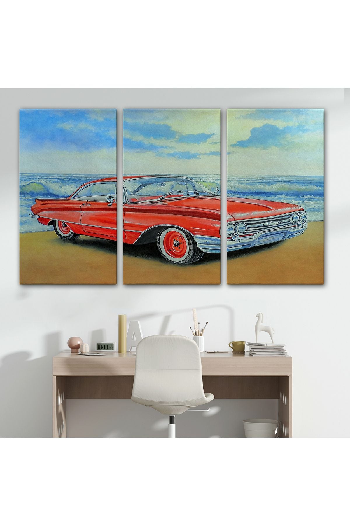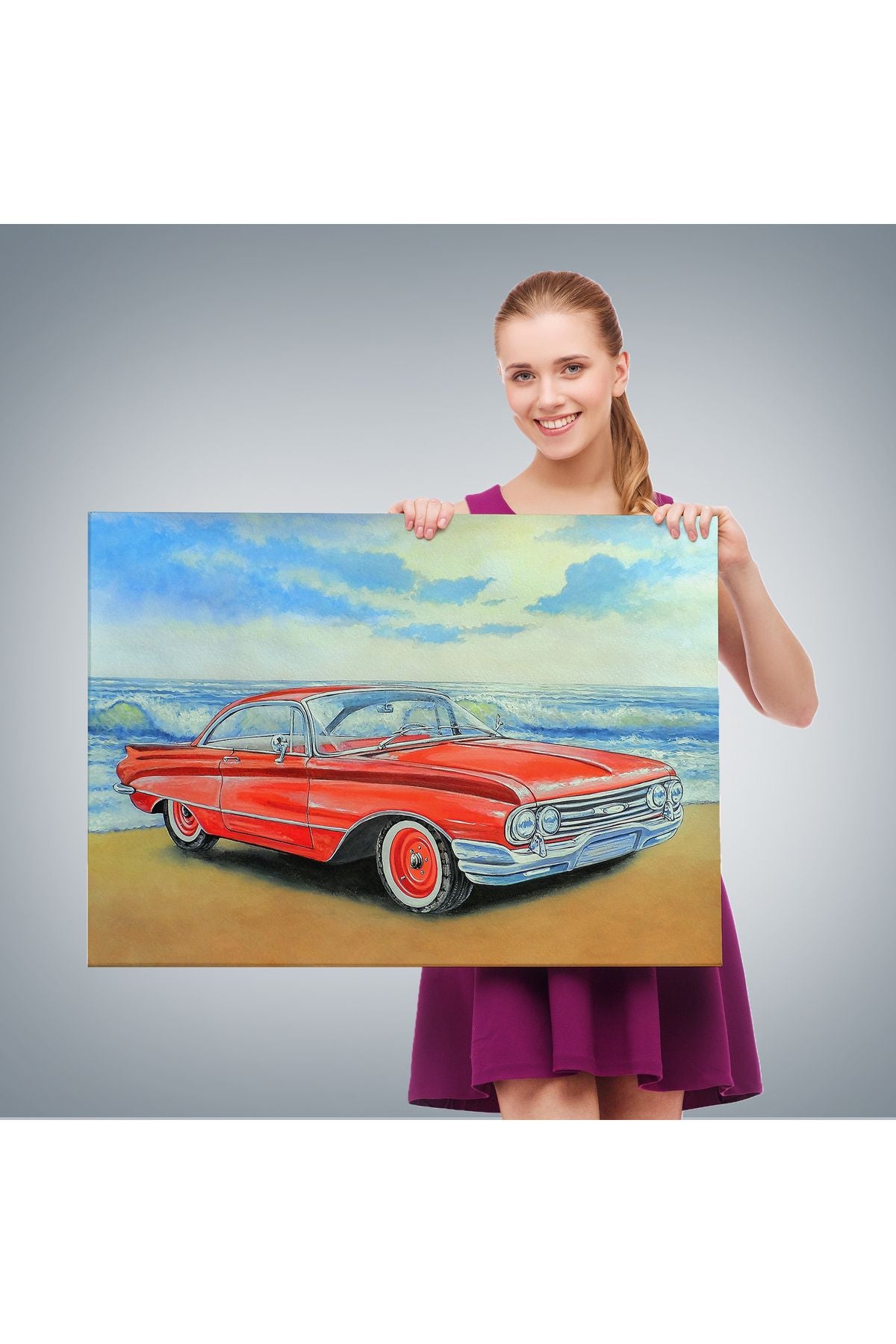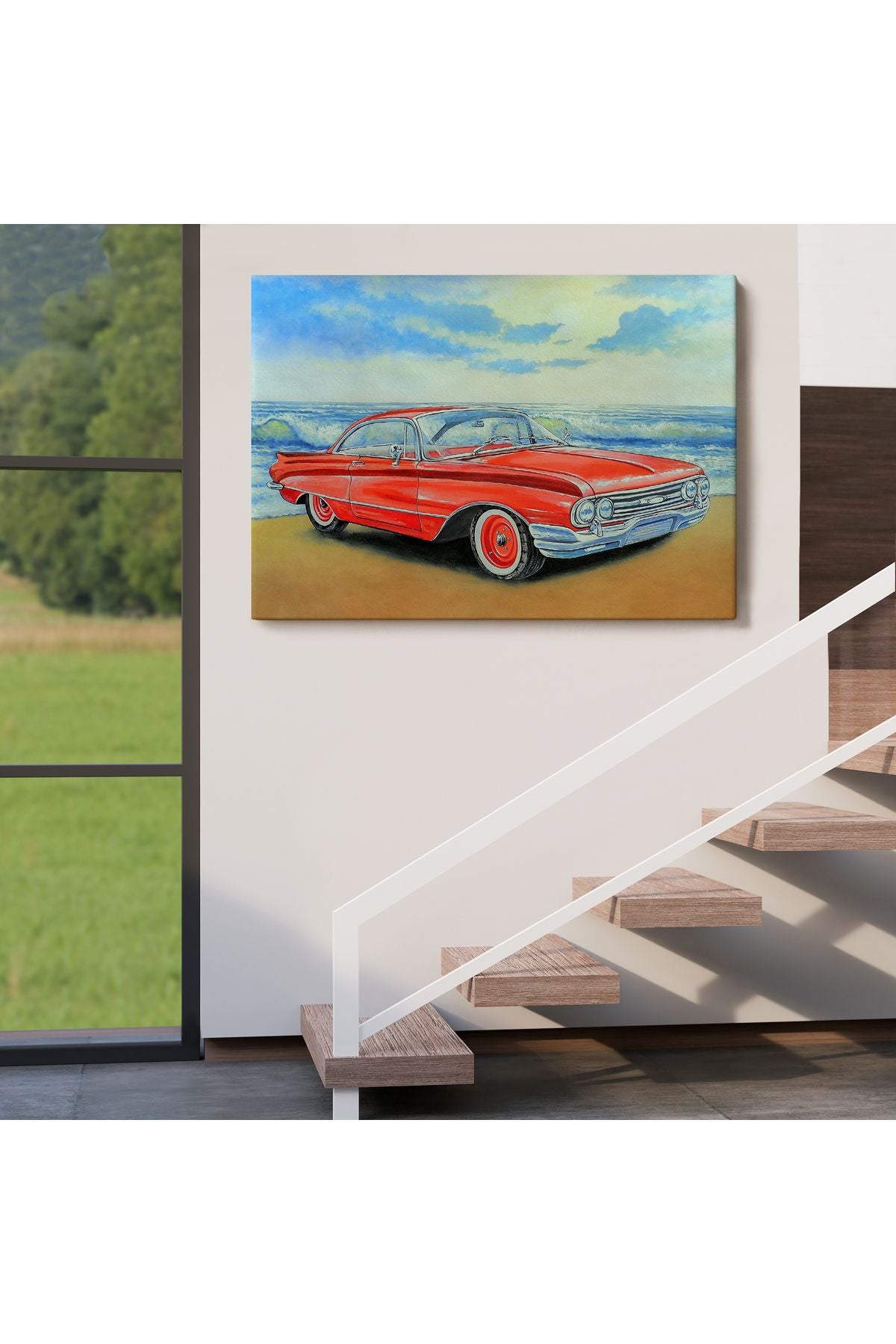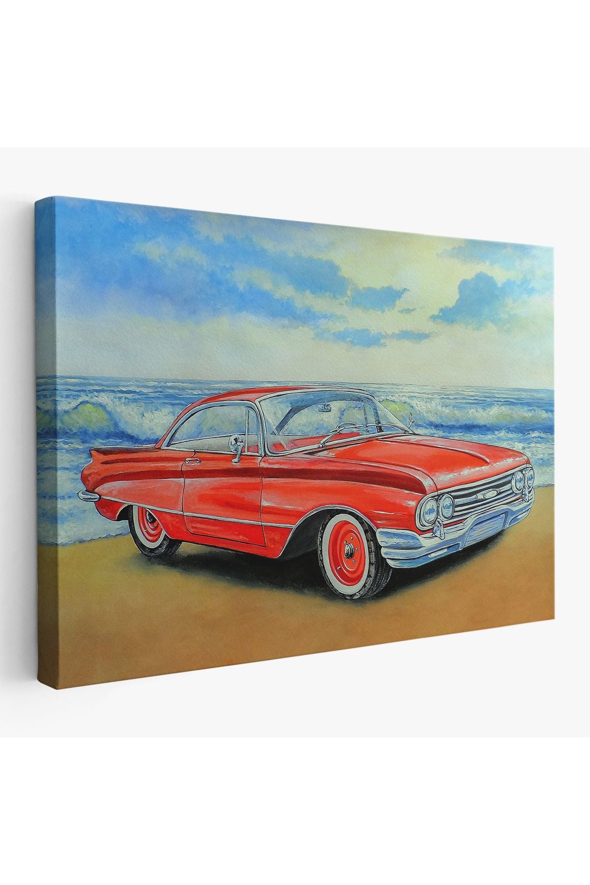 Kızmızı Retro Araba Yağlıboya Görünüm Dekoratif Kanvas Duvar Tablosu-3499