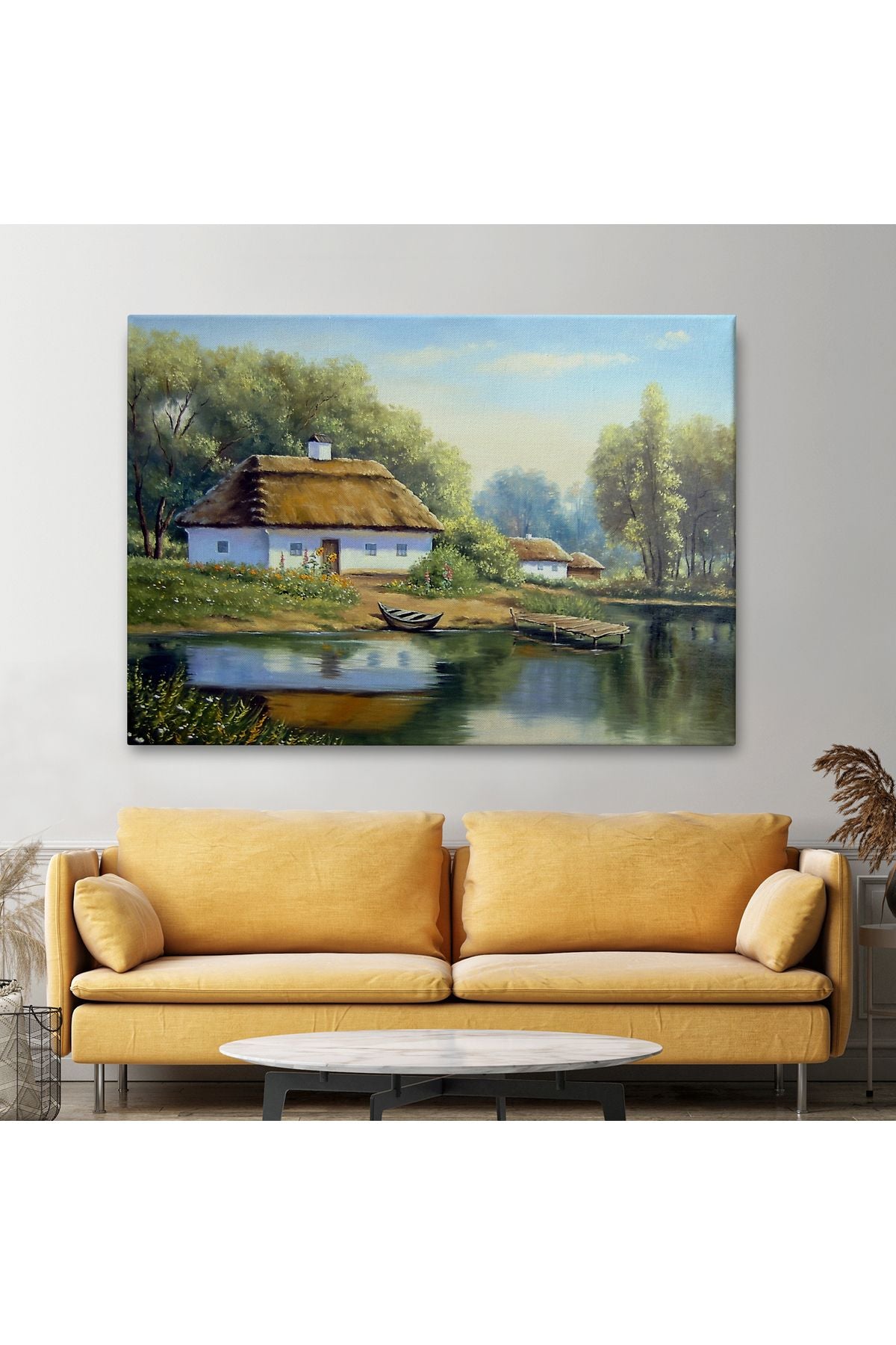 Göl Manzaralı Köy Evi Yağlıboya Görünüm Dekoratif Kanvas Duvar Tablosu-3510
