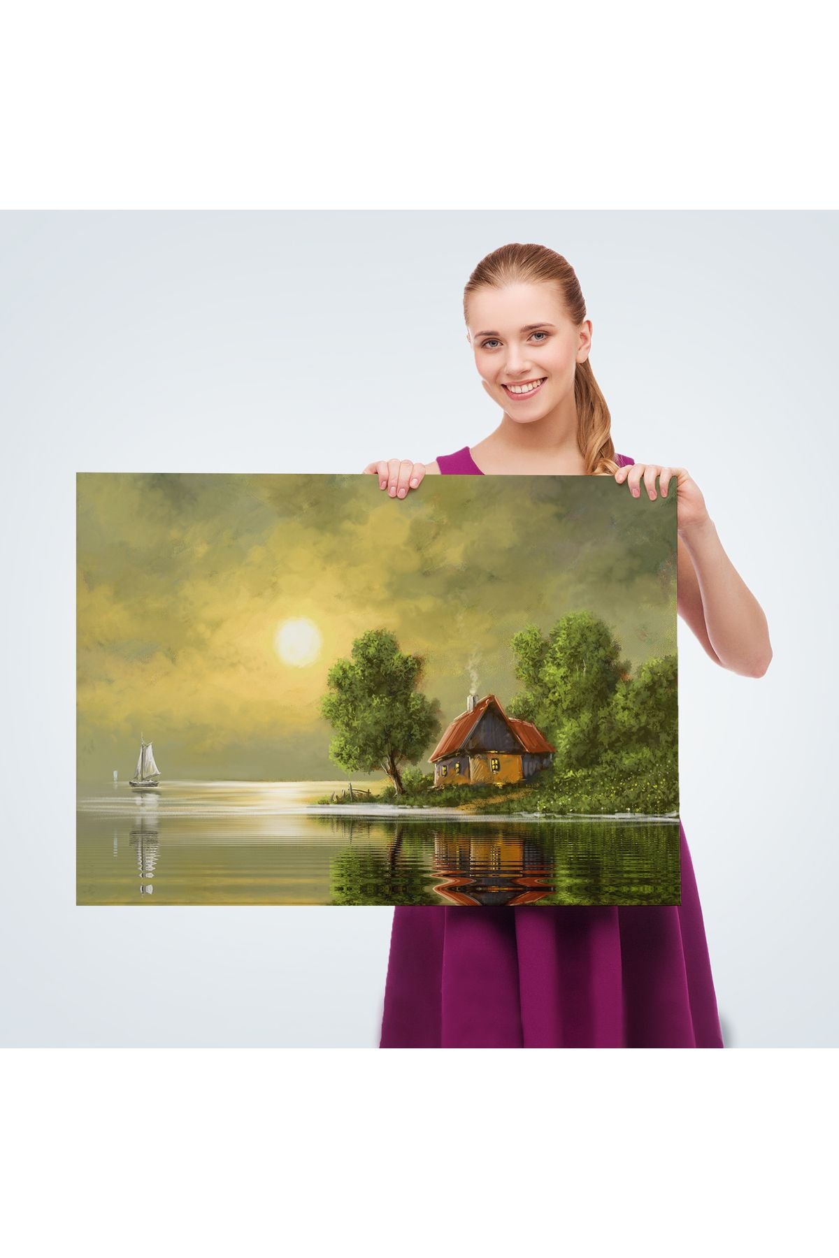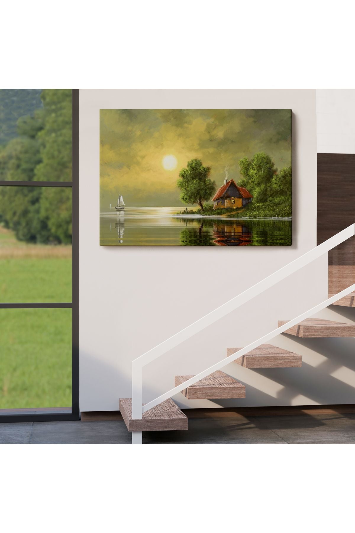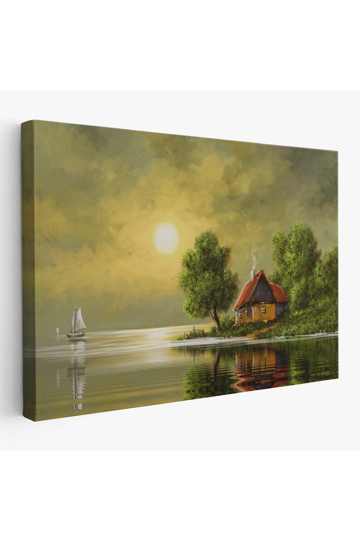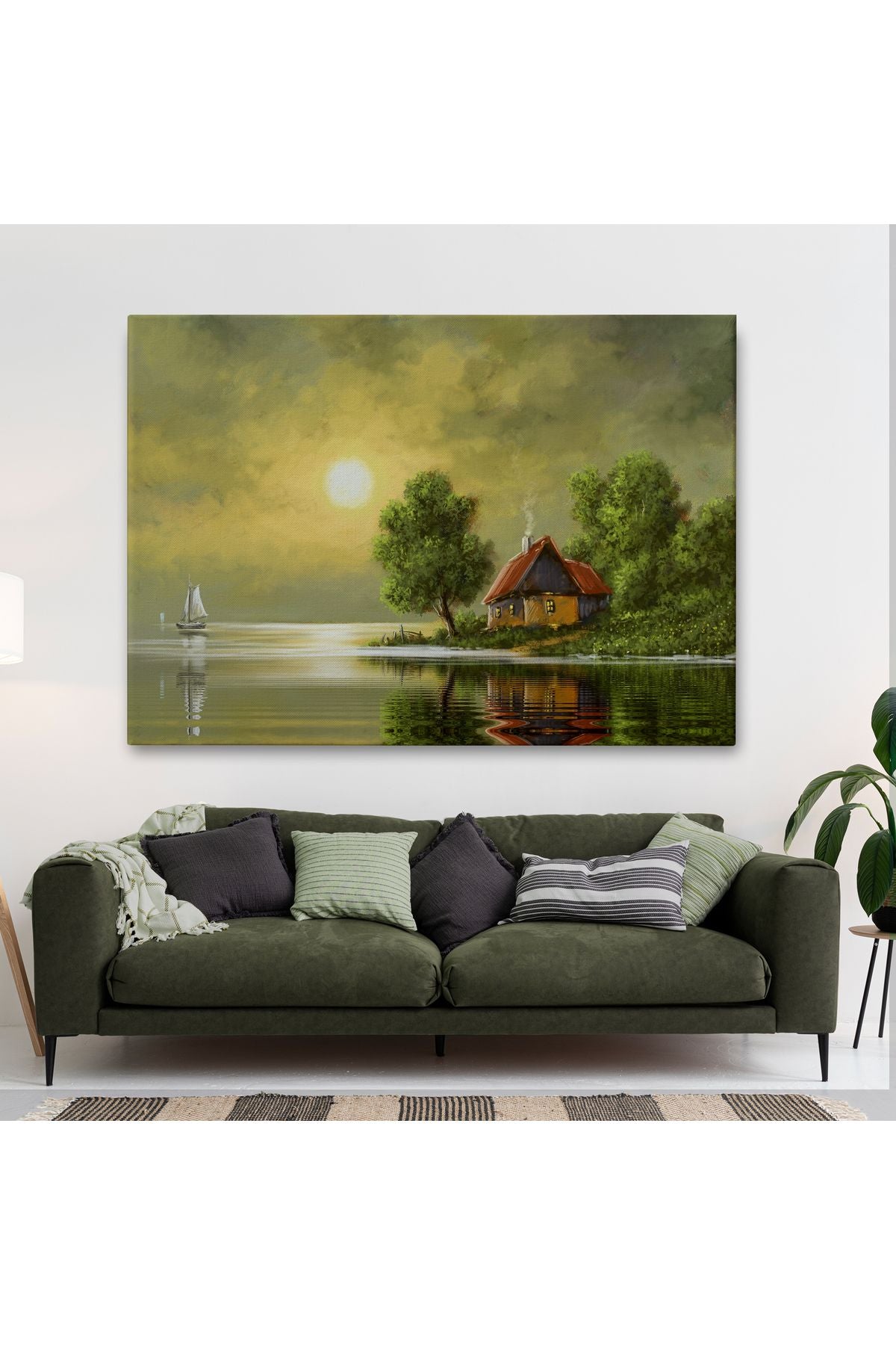 Göl Kenarındaki Köy Evi Yağlıboya Görünüm Dekoratif Kanvas Duvar Tablosu-3592