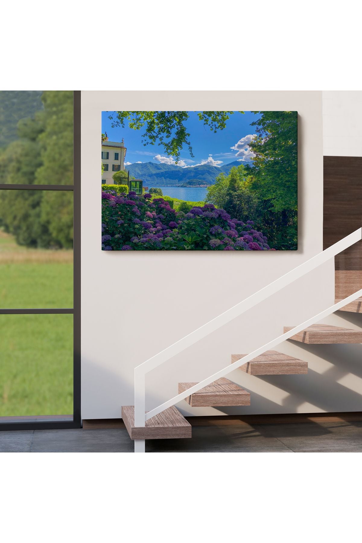 Mor Çiçekler Arasındaki Göl Manzaralı Ev Duvar Tablosu-3673