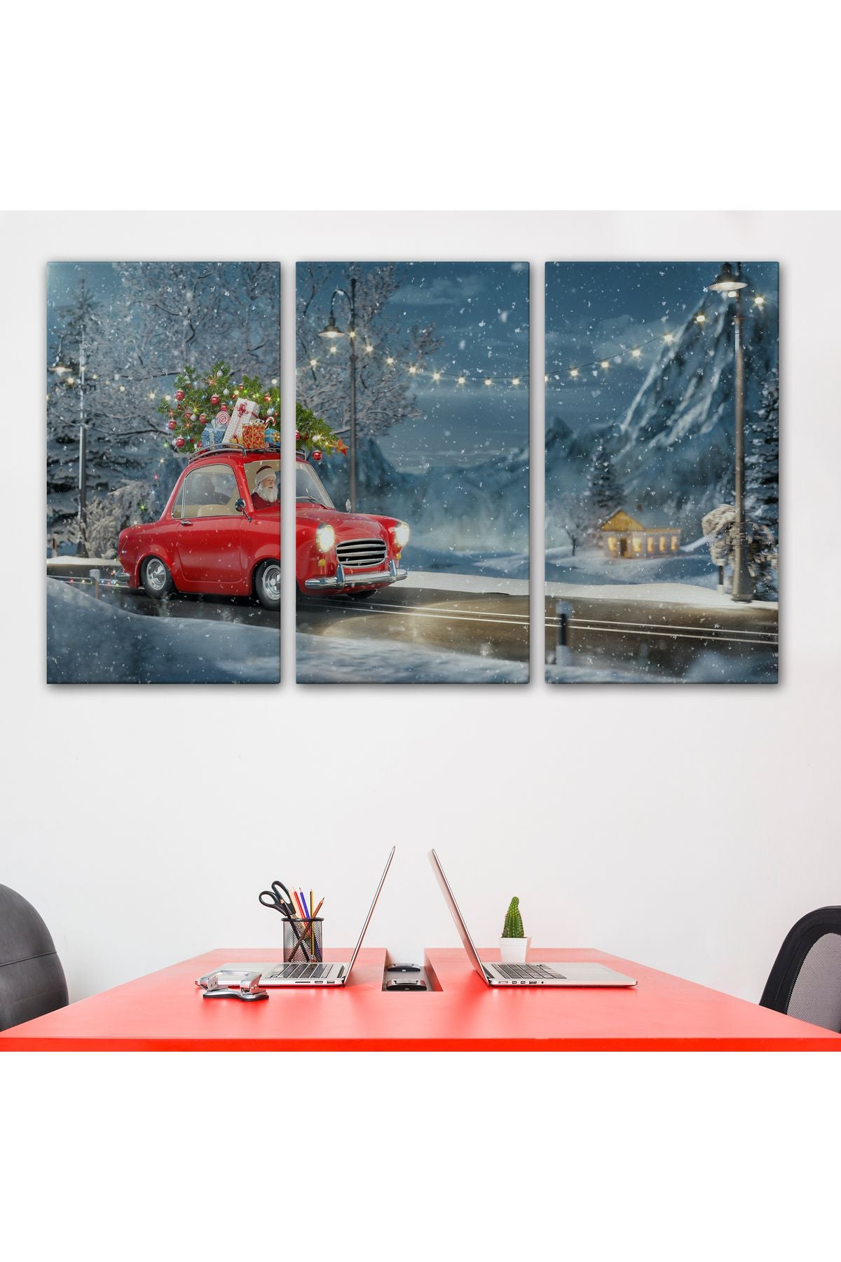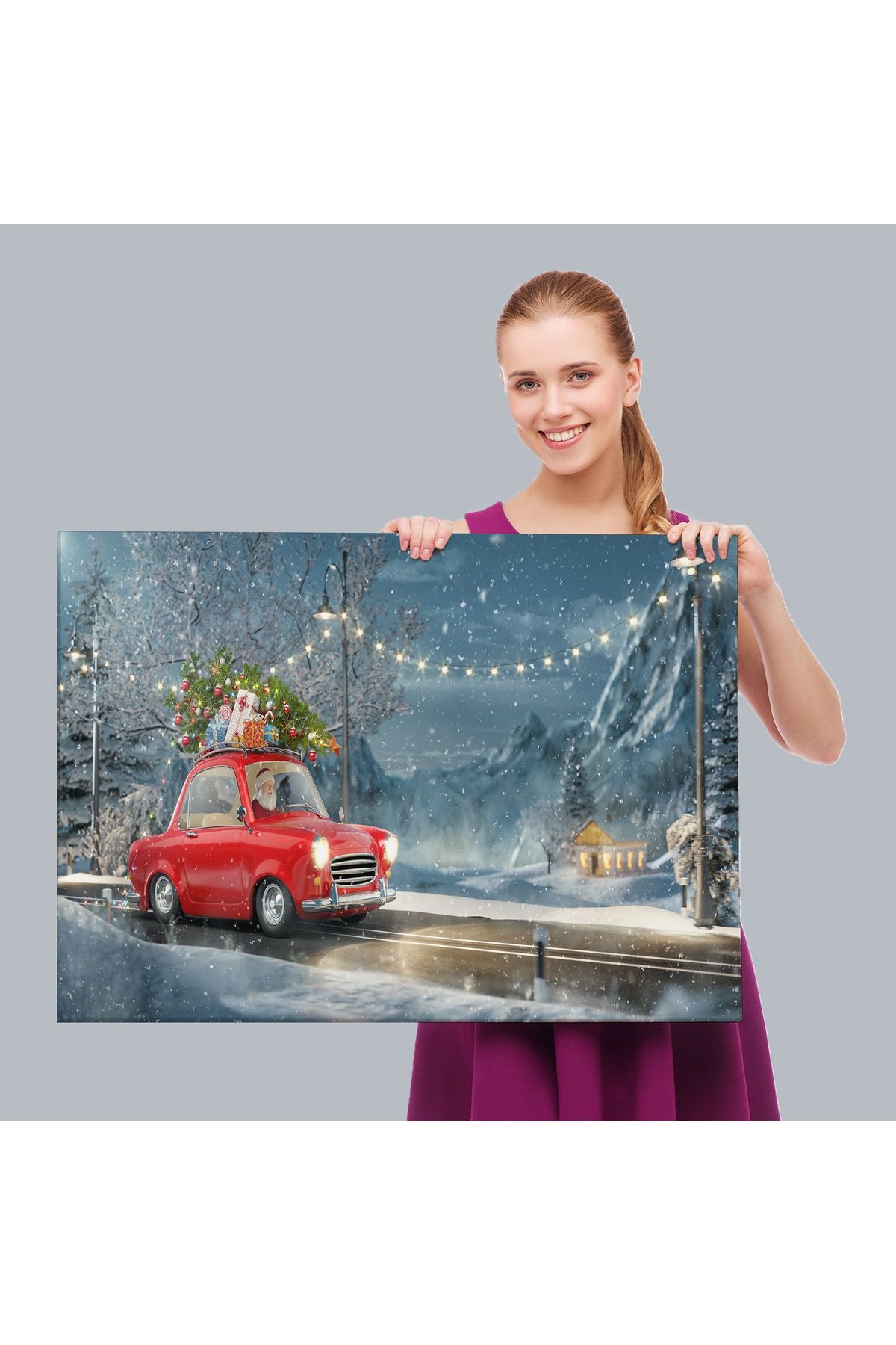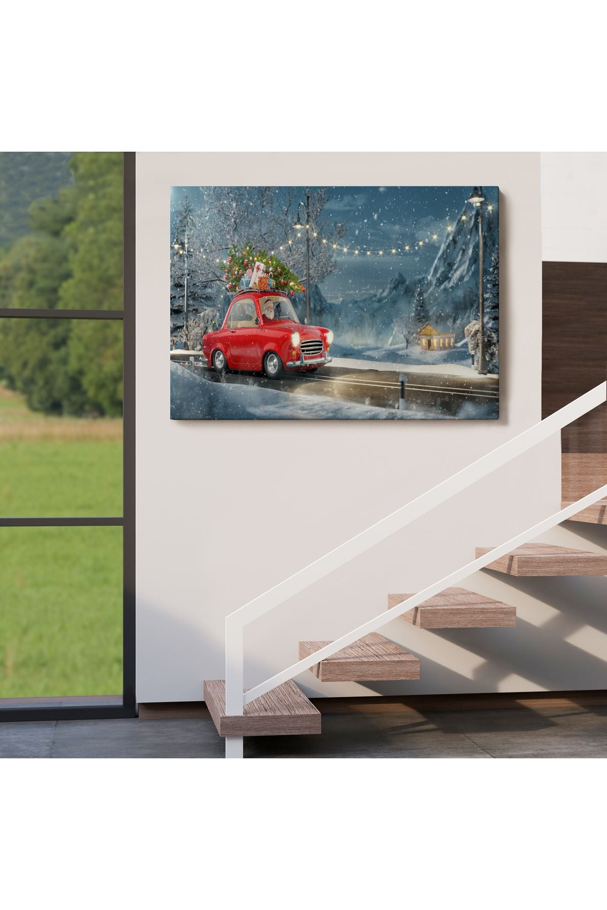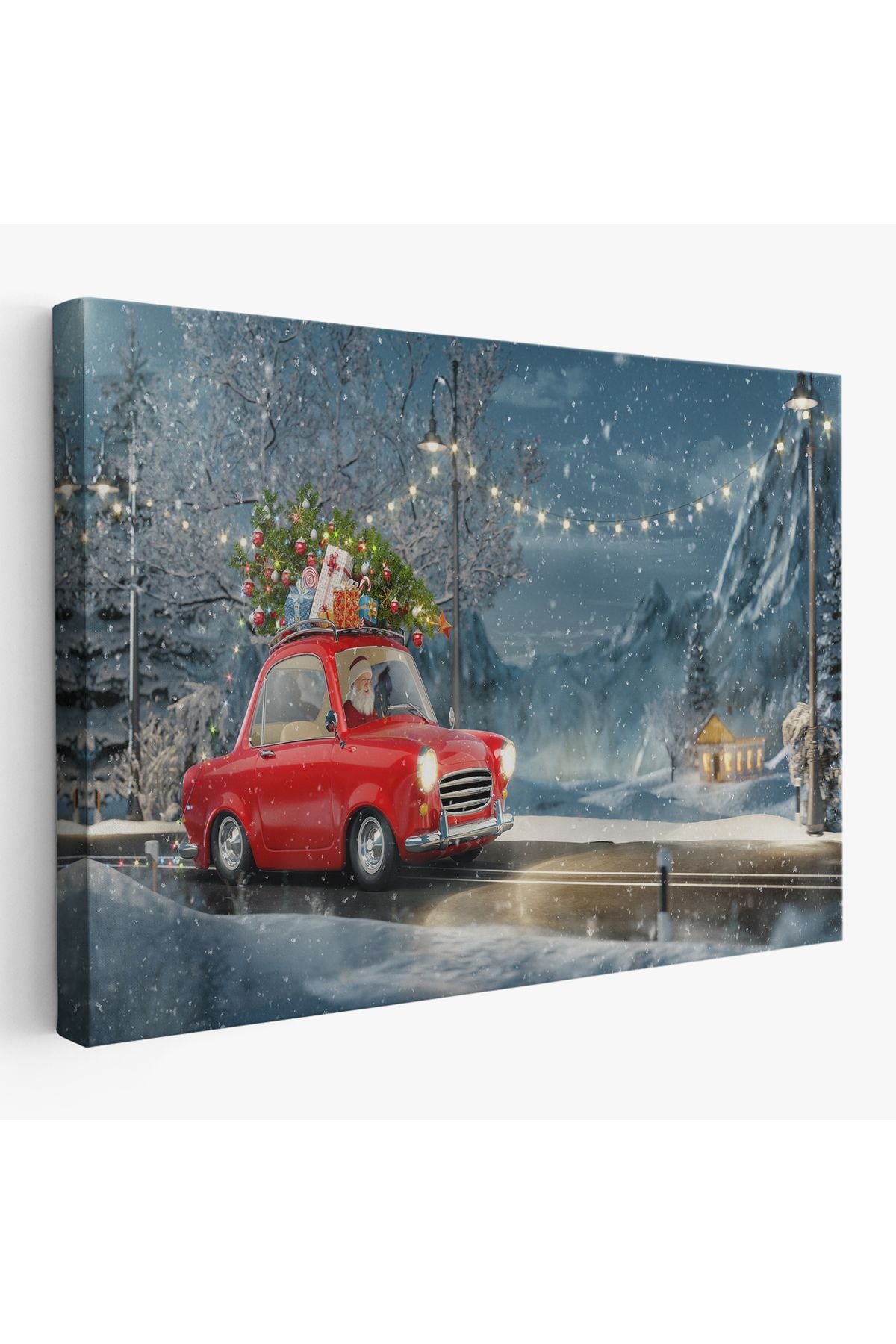 Noel Baba ve Küçük Kırmızı Retro Arabası Kanvas Duvar Tablosu-3752