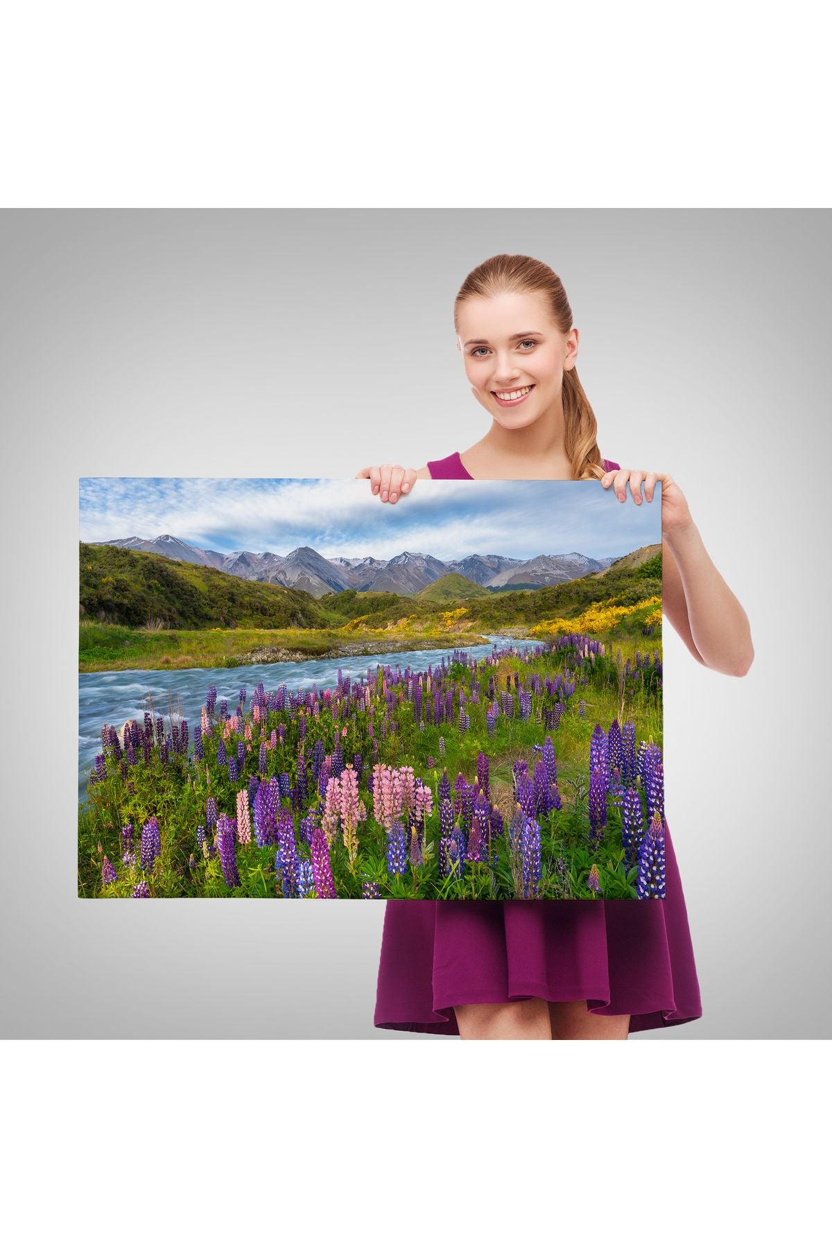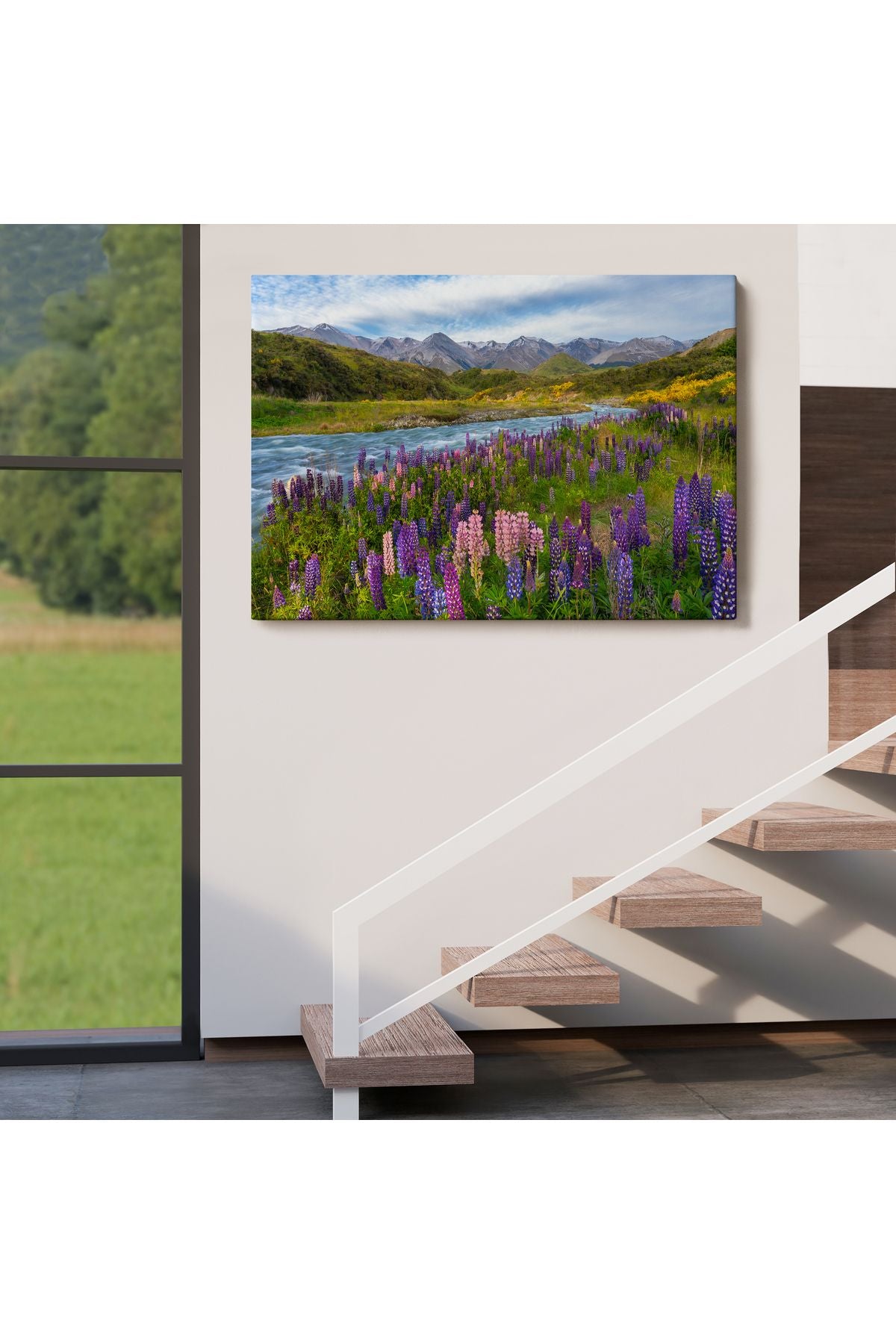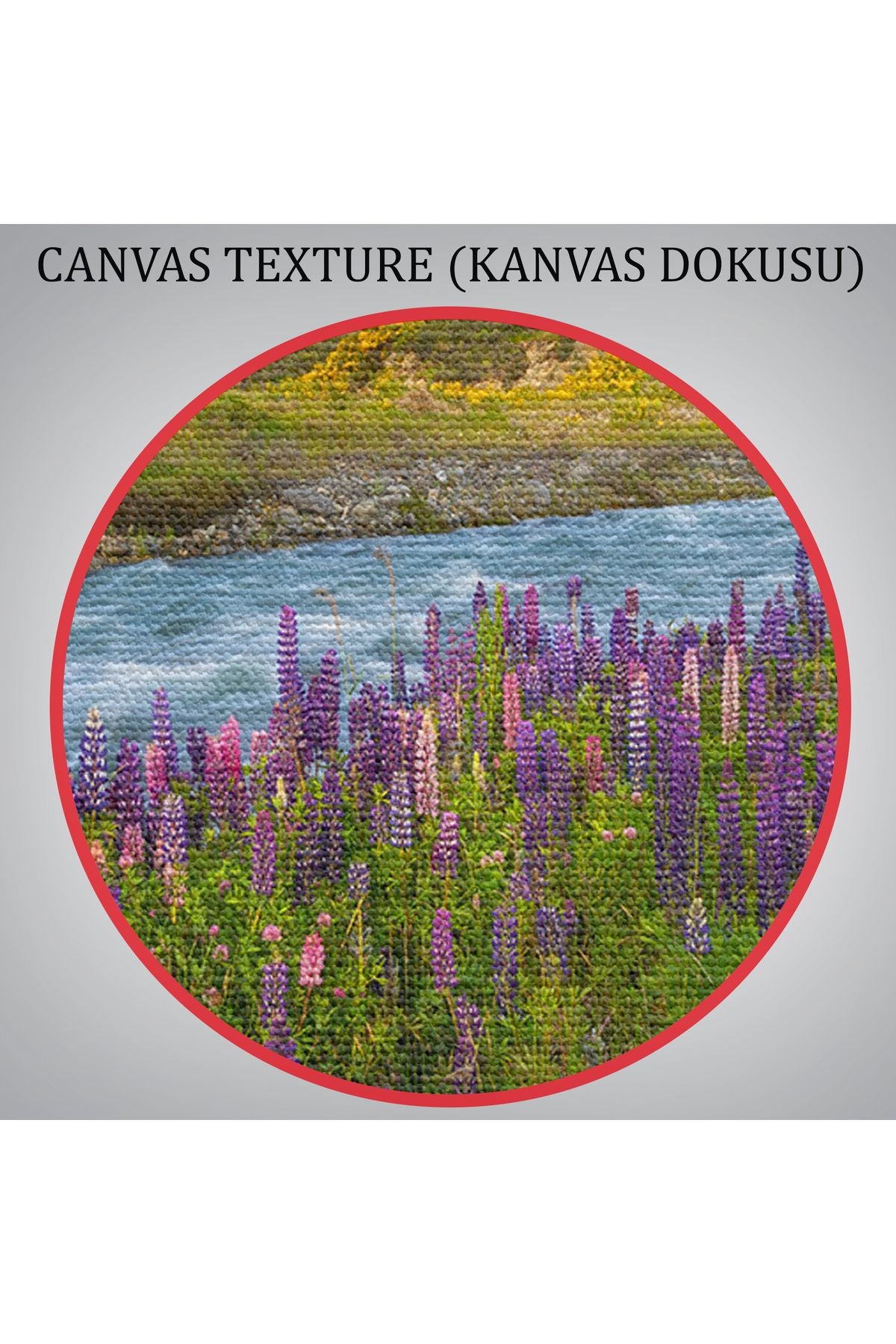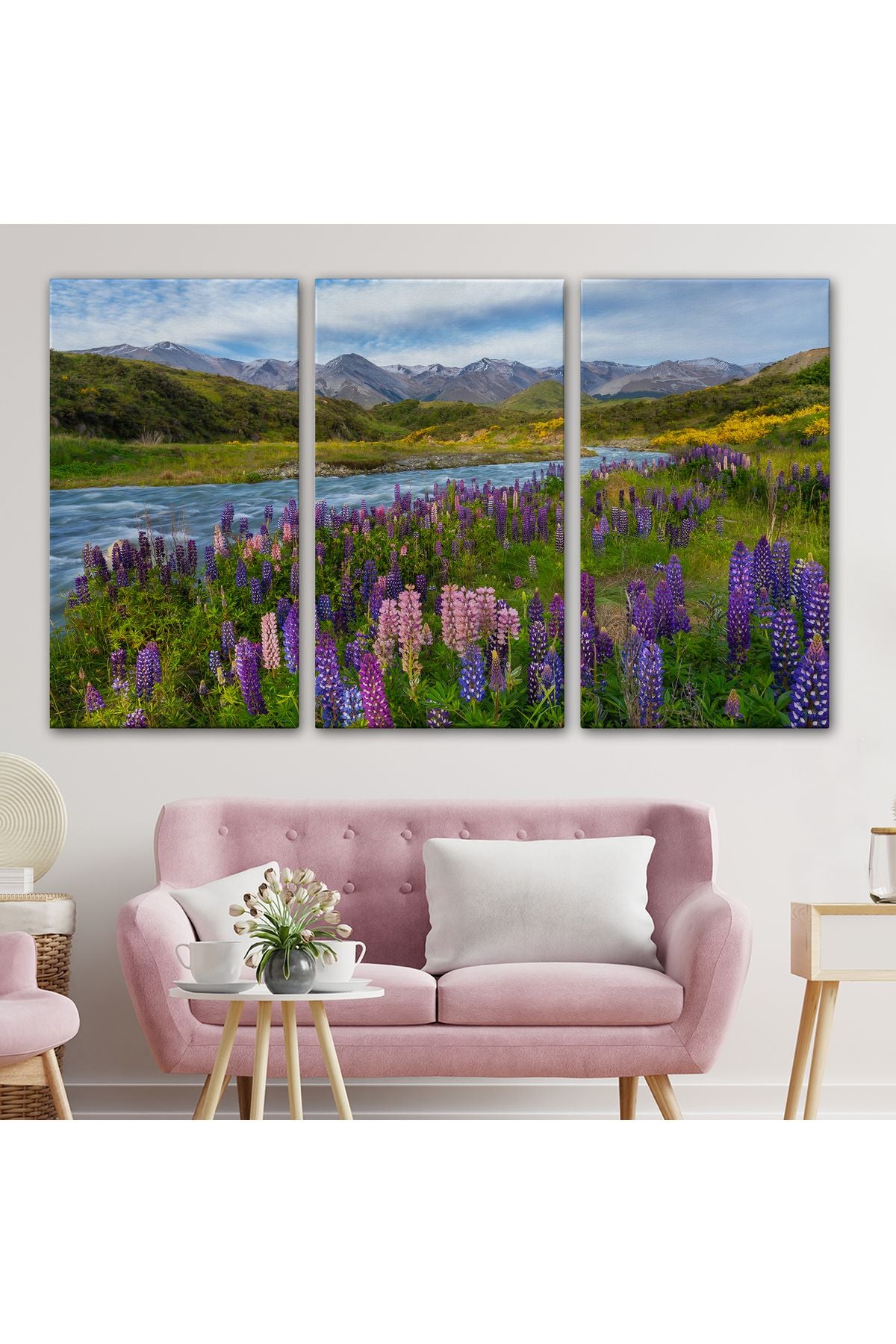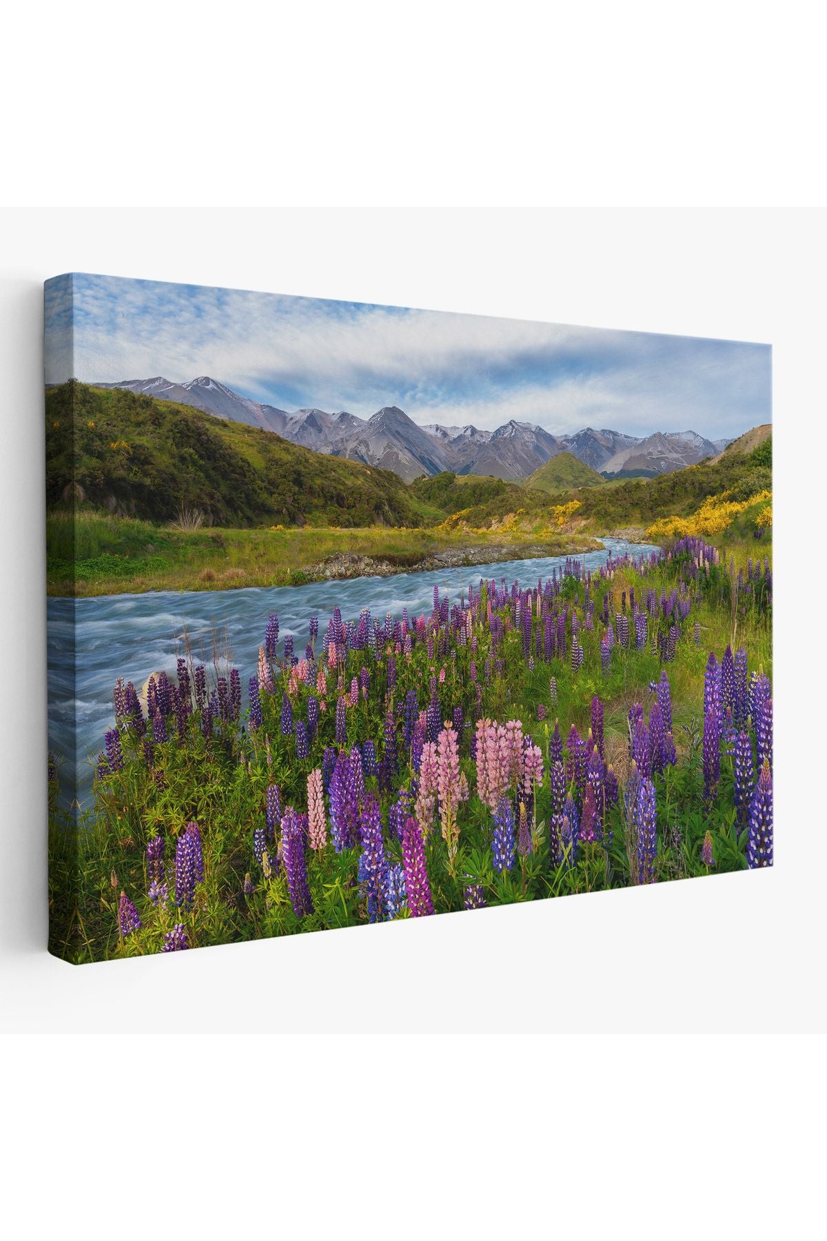 Nehir Dağ ve Mor Acı Bakla Çiçekleri Manzarası Duvar Tablosu-3759