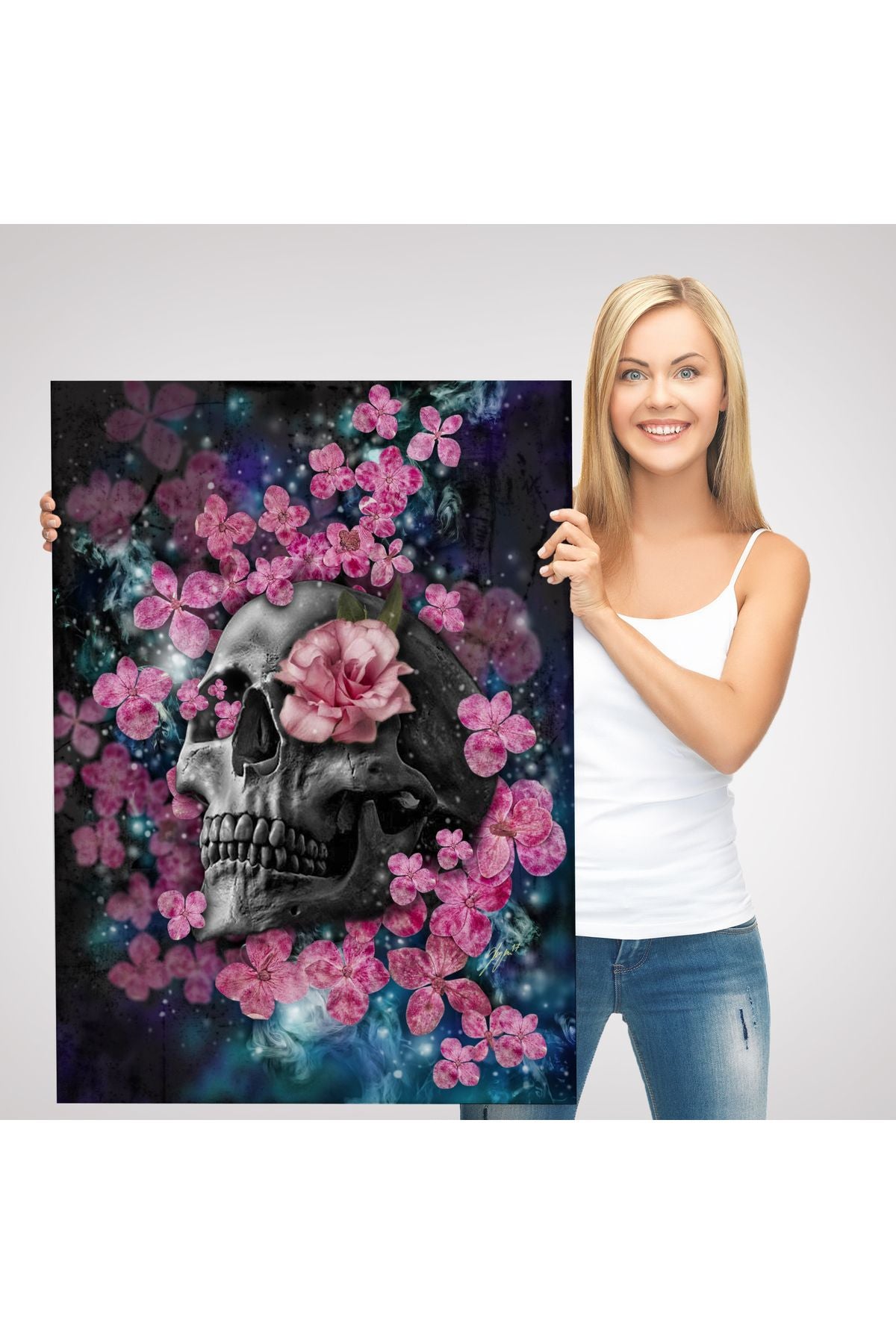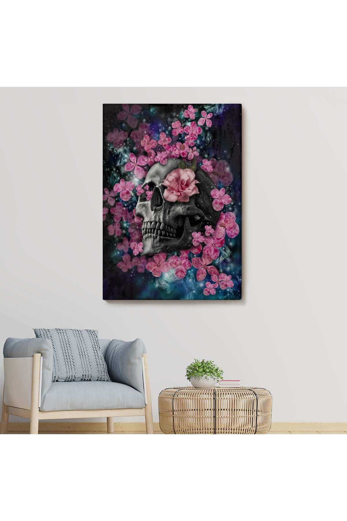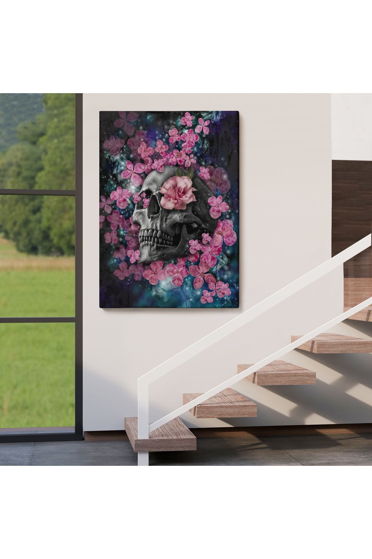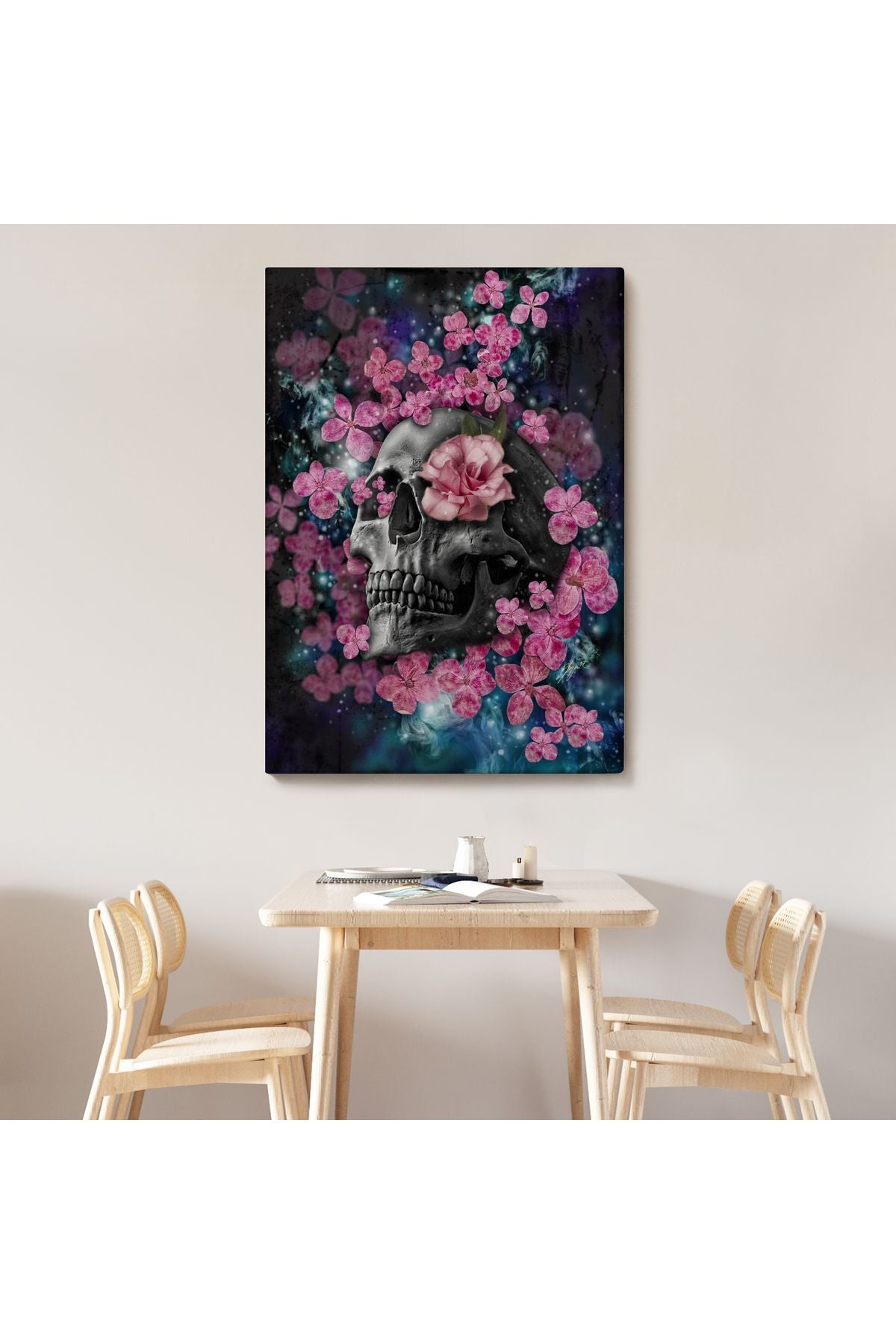 İskelet Kafa ve Pembe Çiçekler Kanvas Tablo Duvar Sanatı-5234
