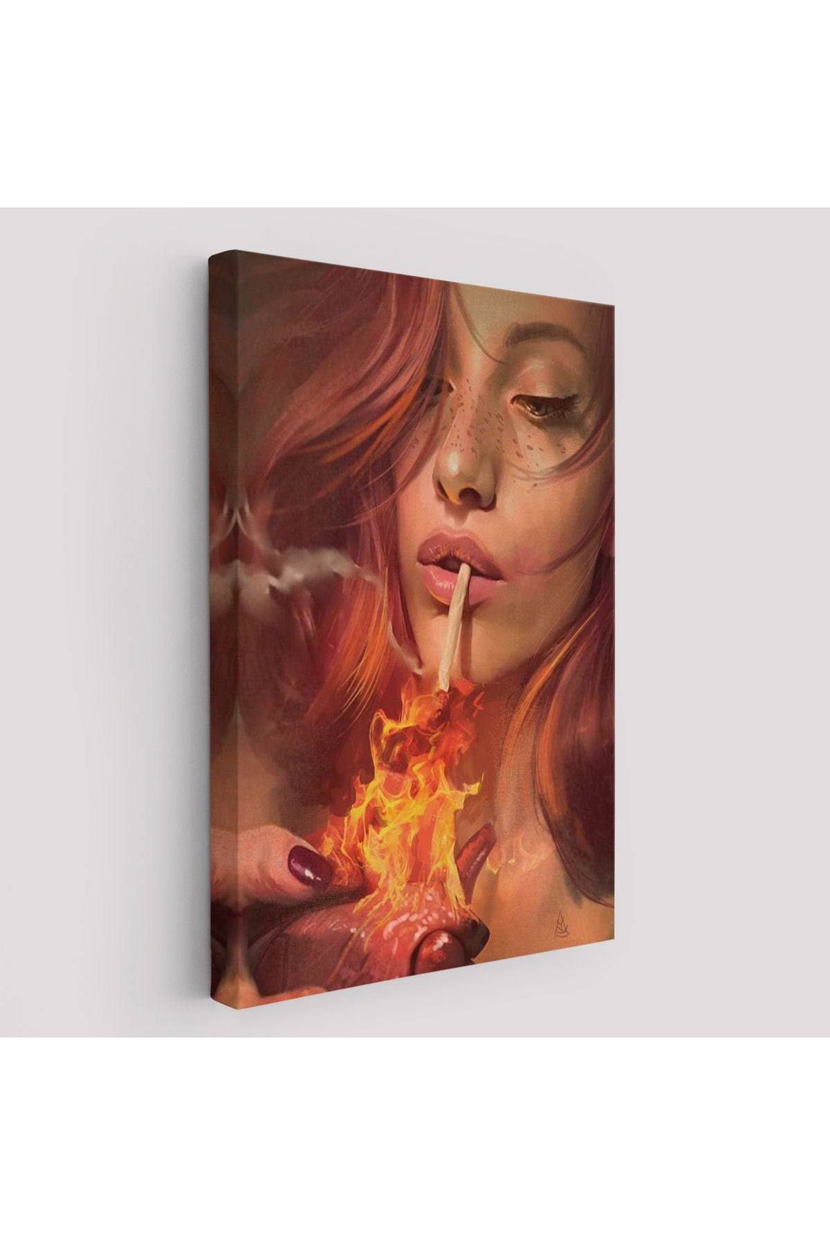 Platonik Aşkın Tavrı Sigarasını Yanan Bir Kalpten Yakan Kadın Kanvas Tablo-5247