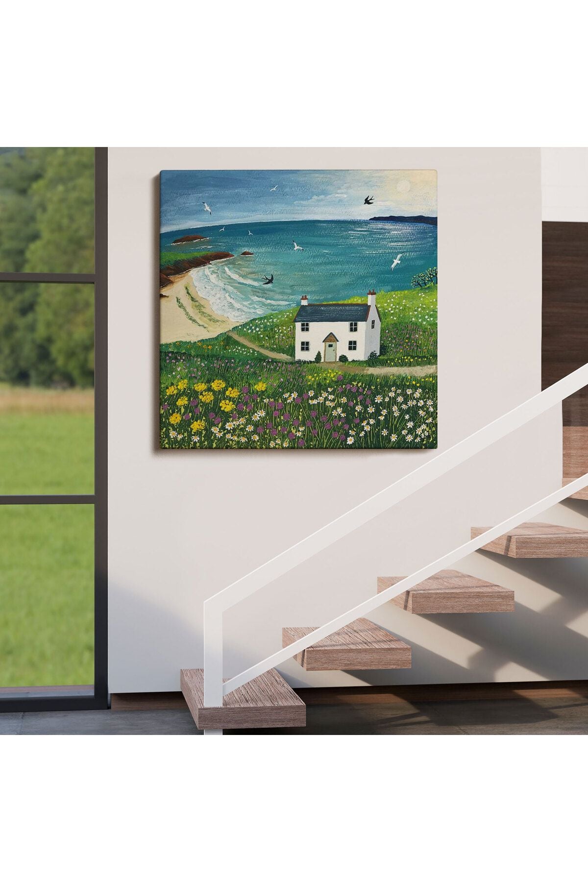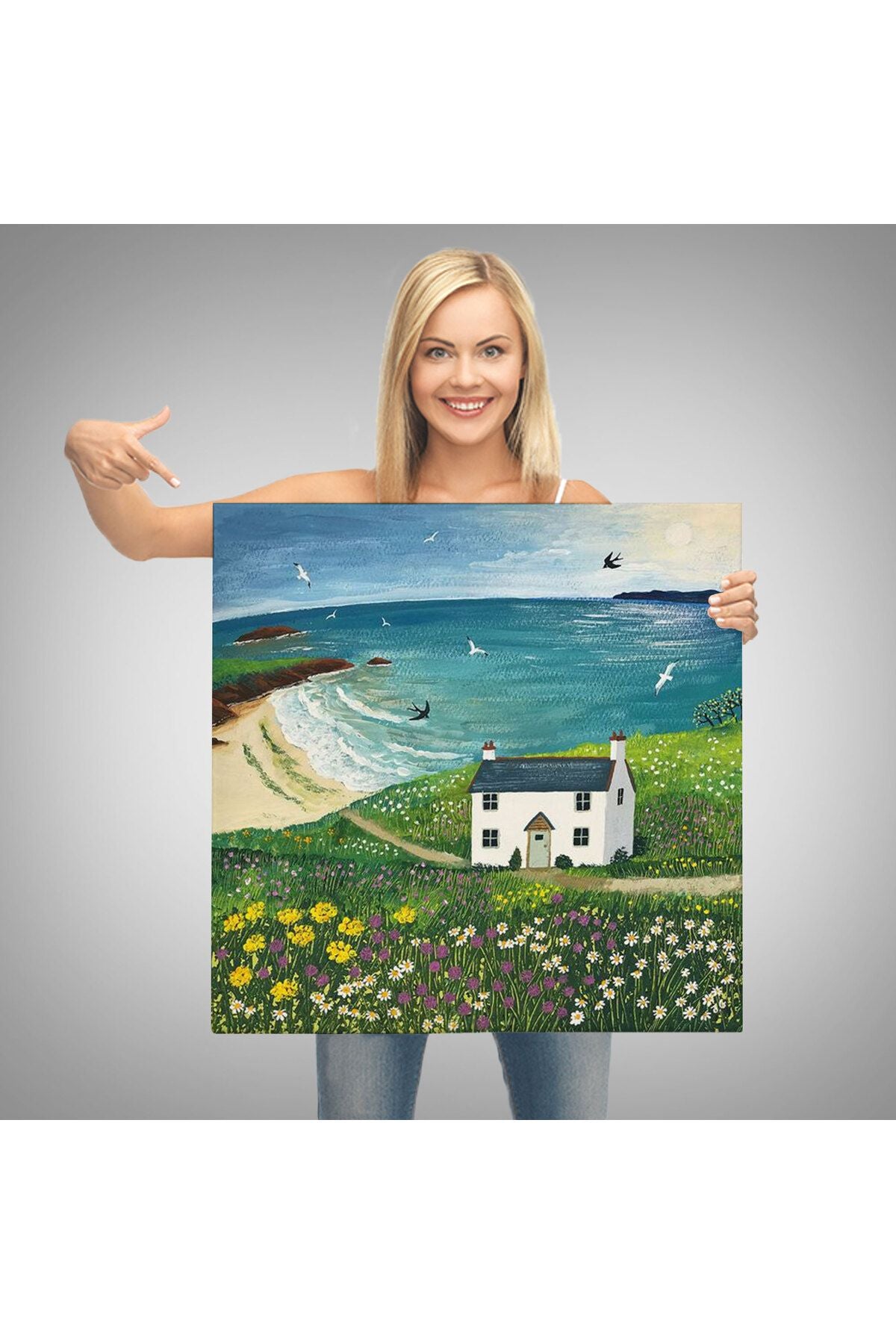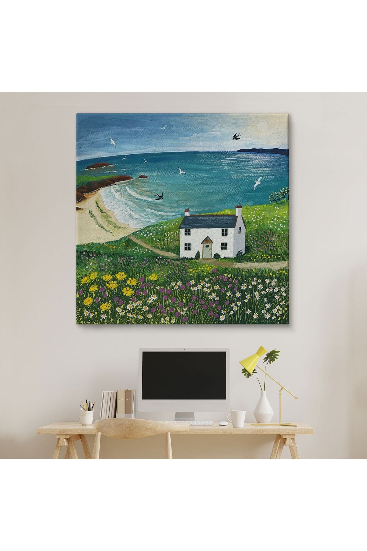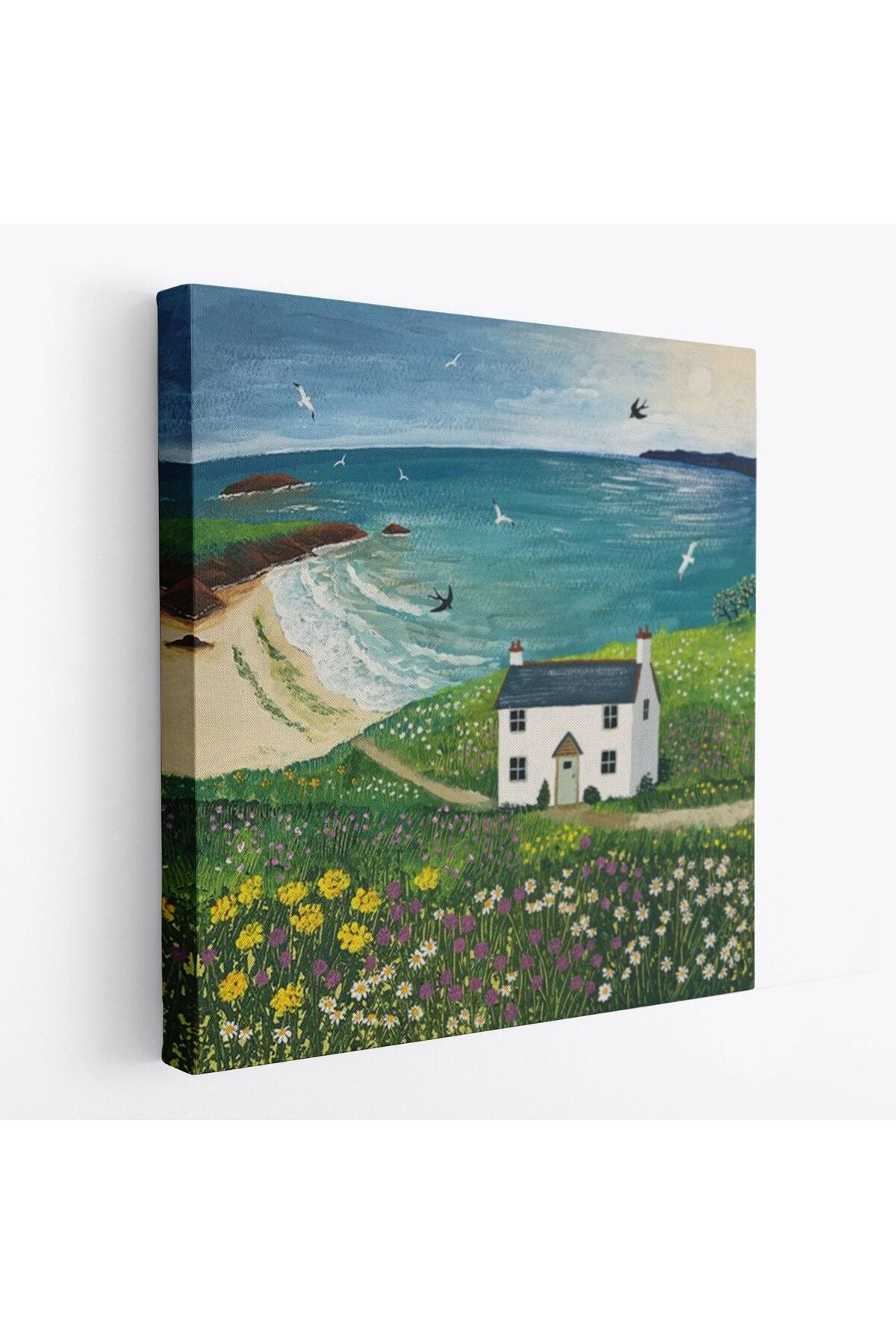 İngiltere Sahilindeki Beyaz Külübe, Martılar ve Çiçekler Kanvas Tablo-5852