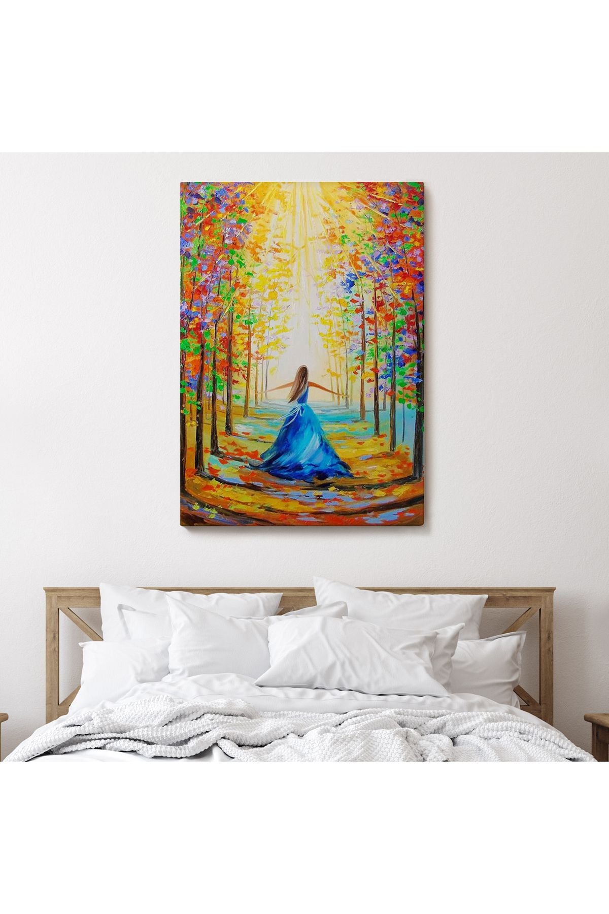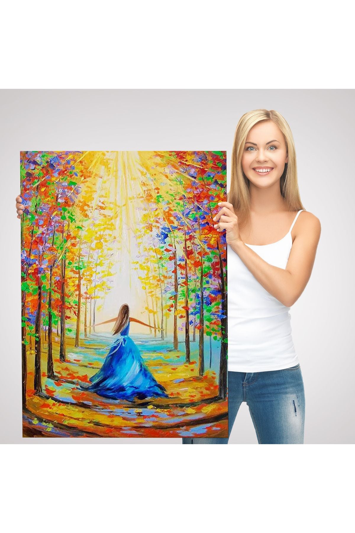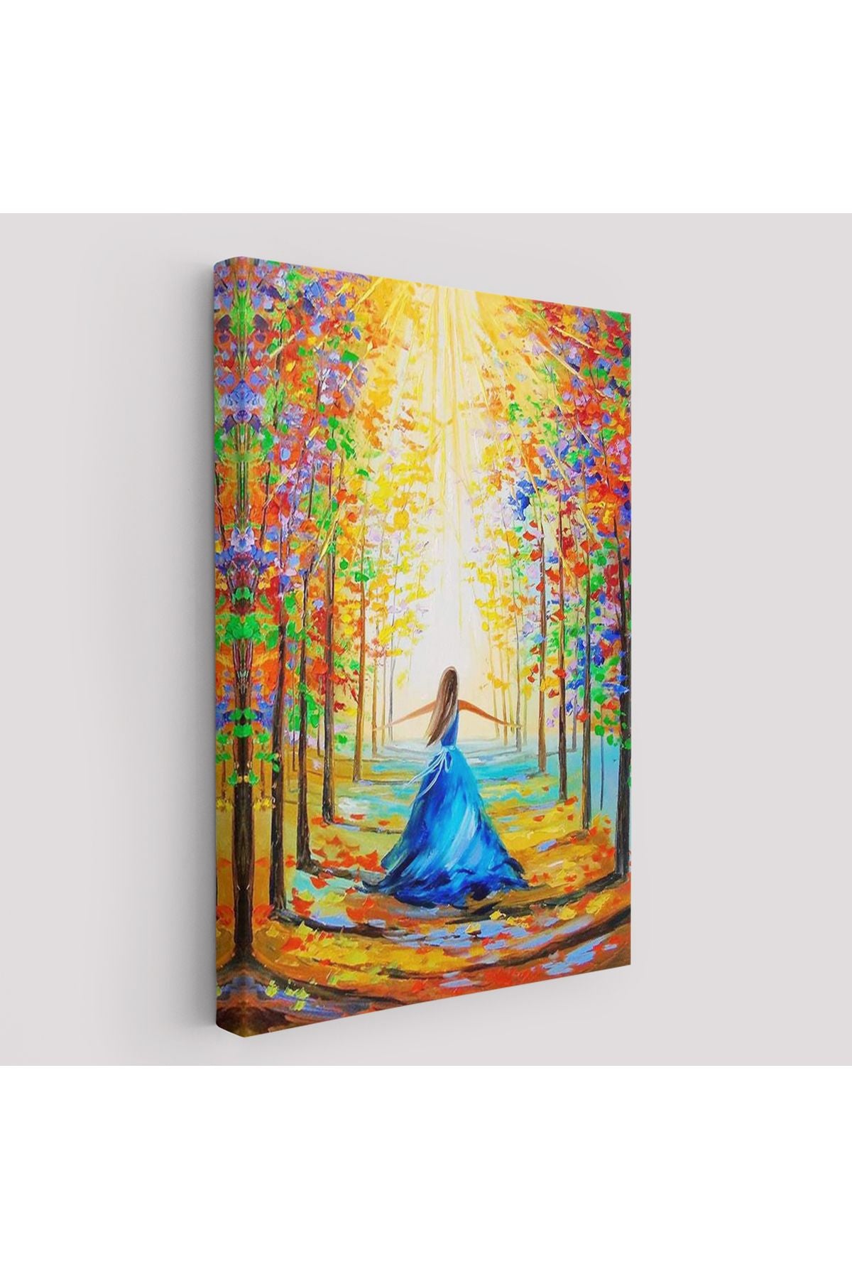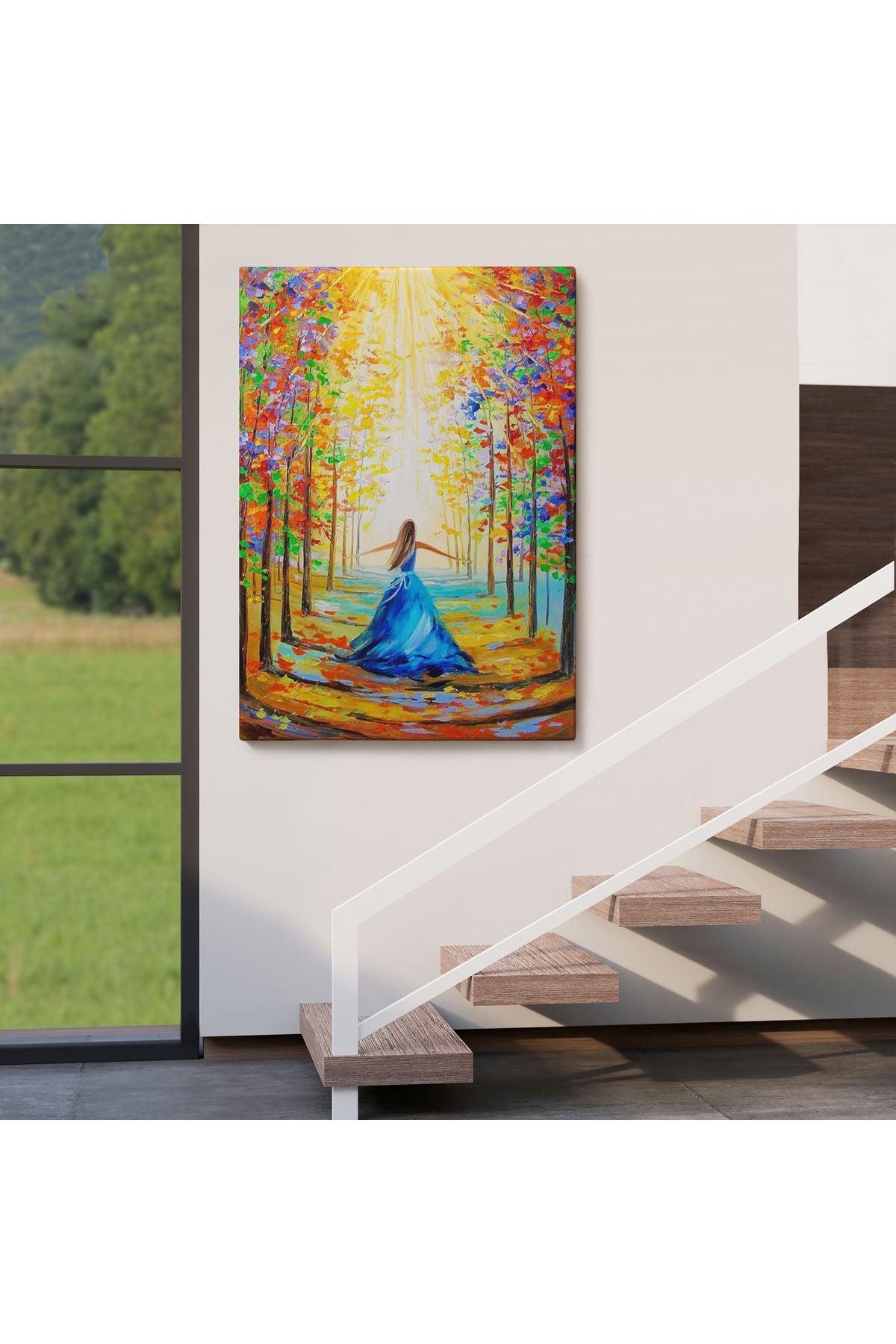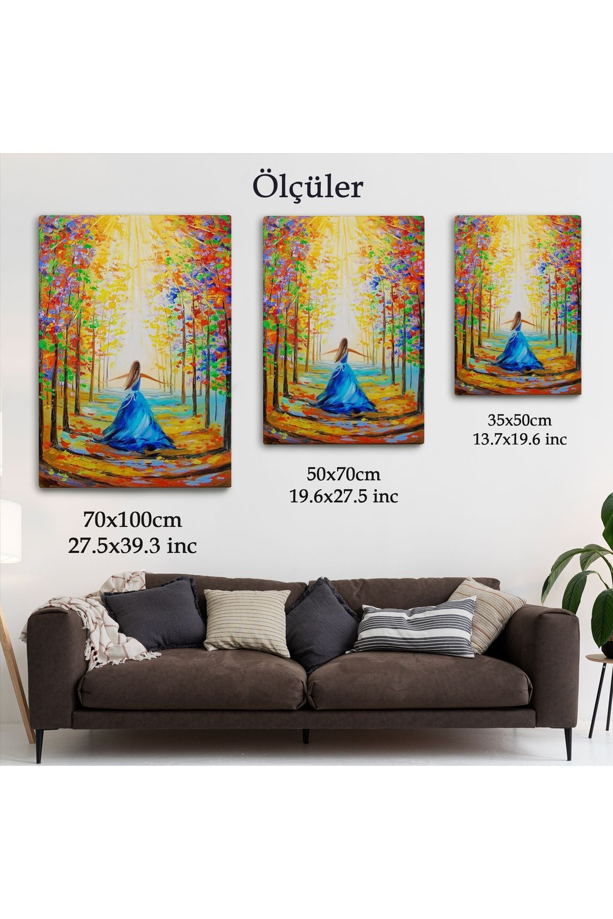 Renkli Ormanda Yürüyen Mavi Elbiseli Kadın Tablosu-6039