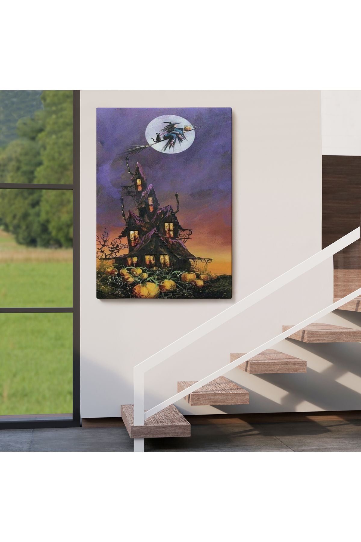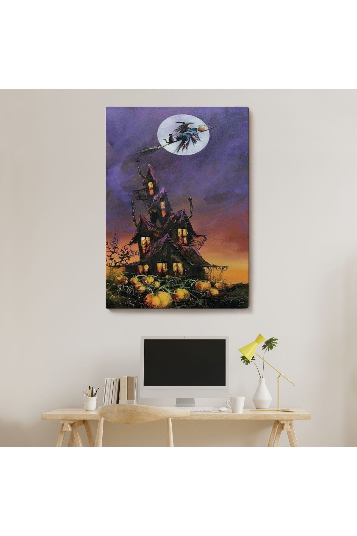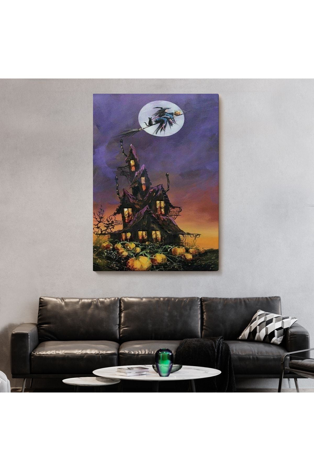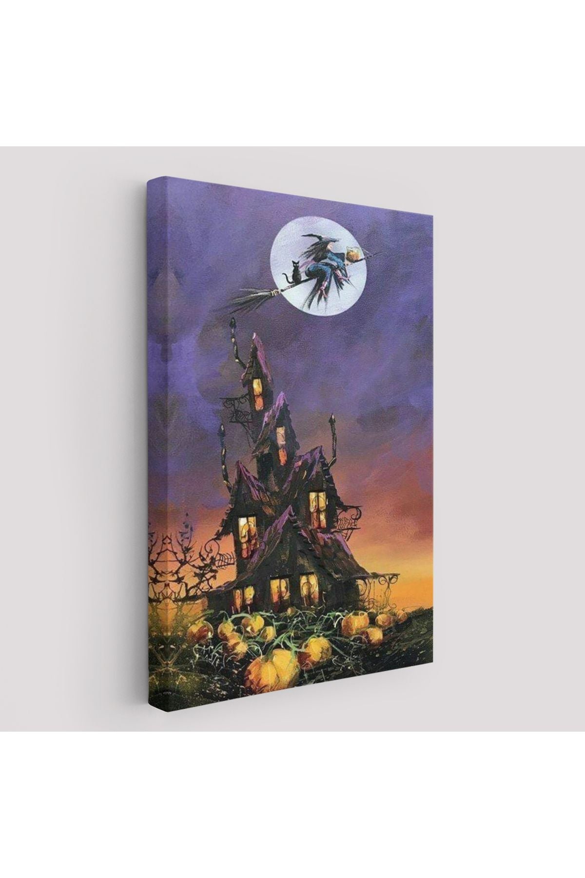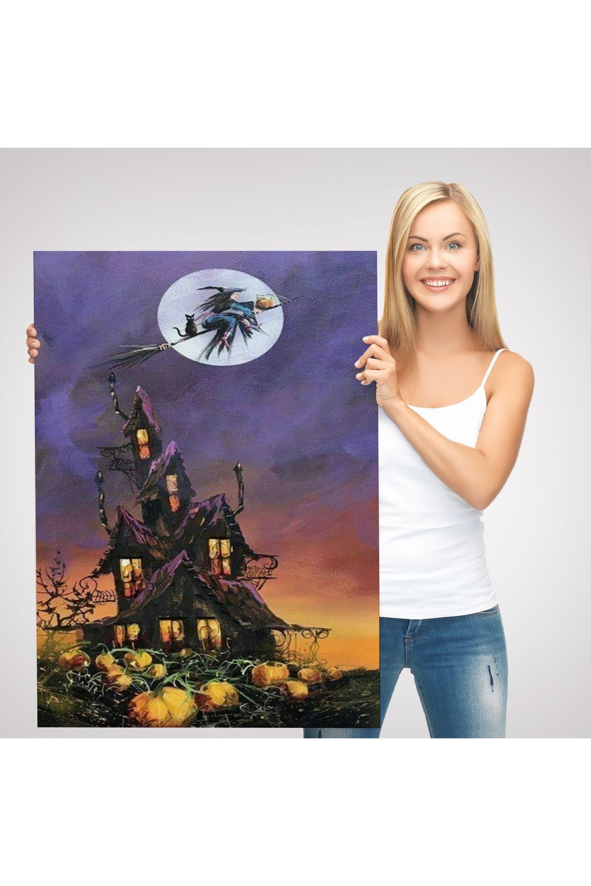 Süpürge İle Uçan Cadı ve Kedisi Cadılar Bayramı Helloven Duvar Tablosu -6078