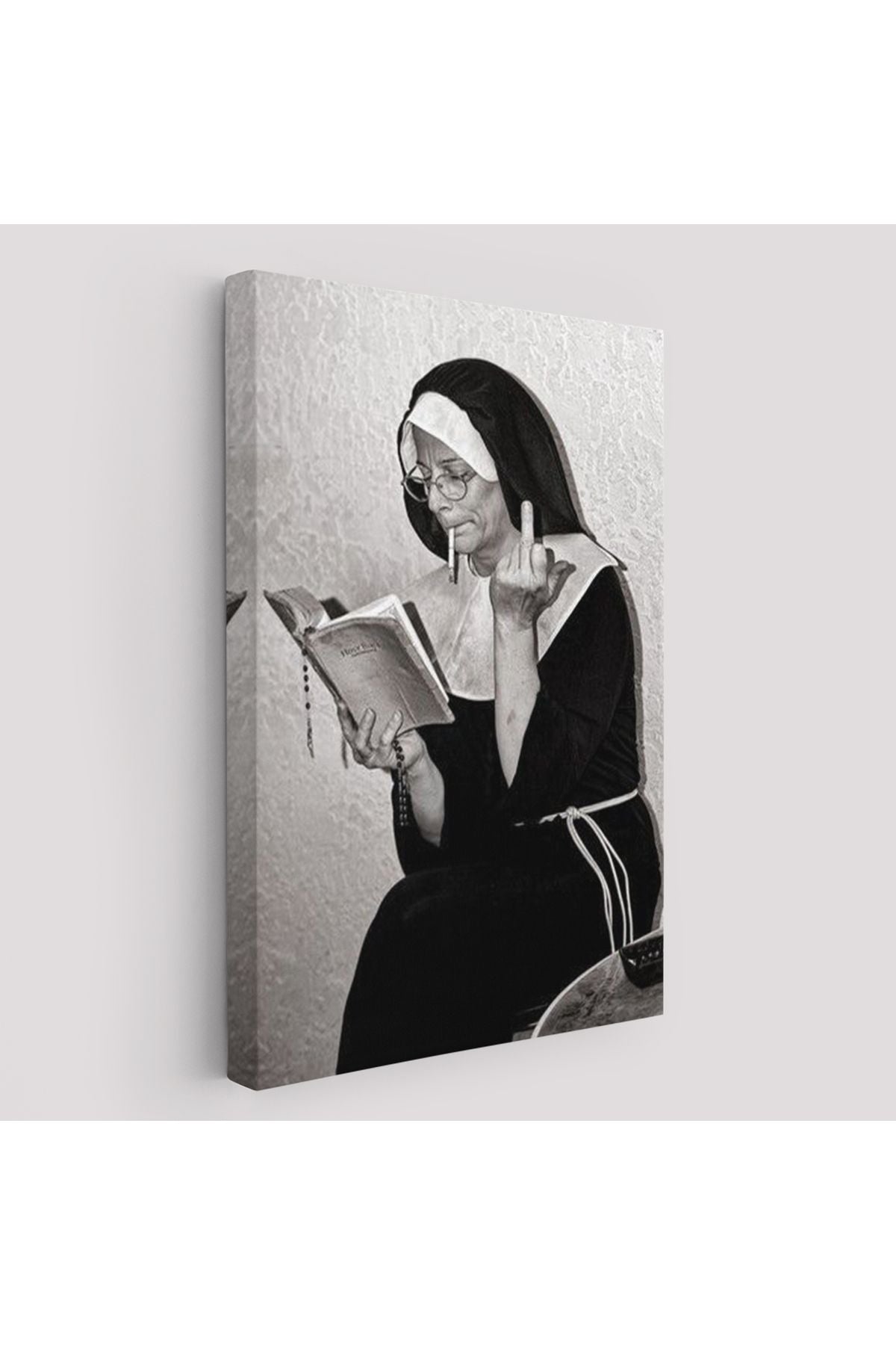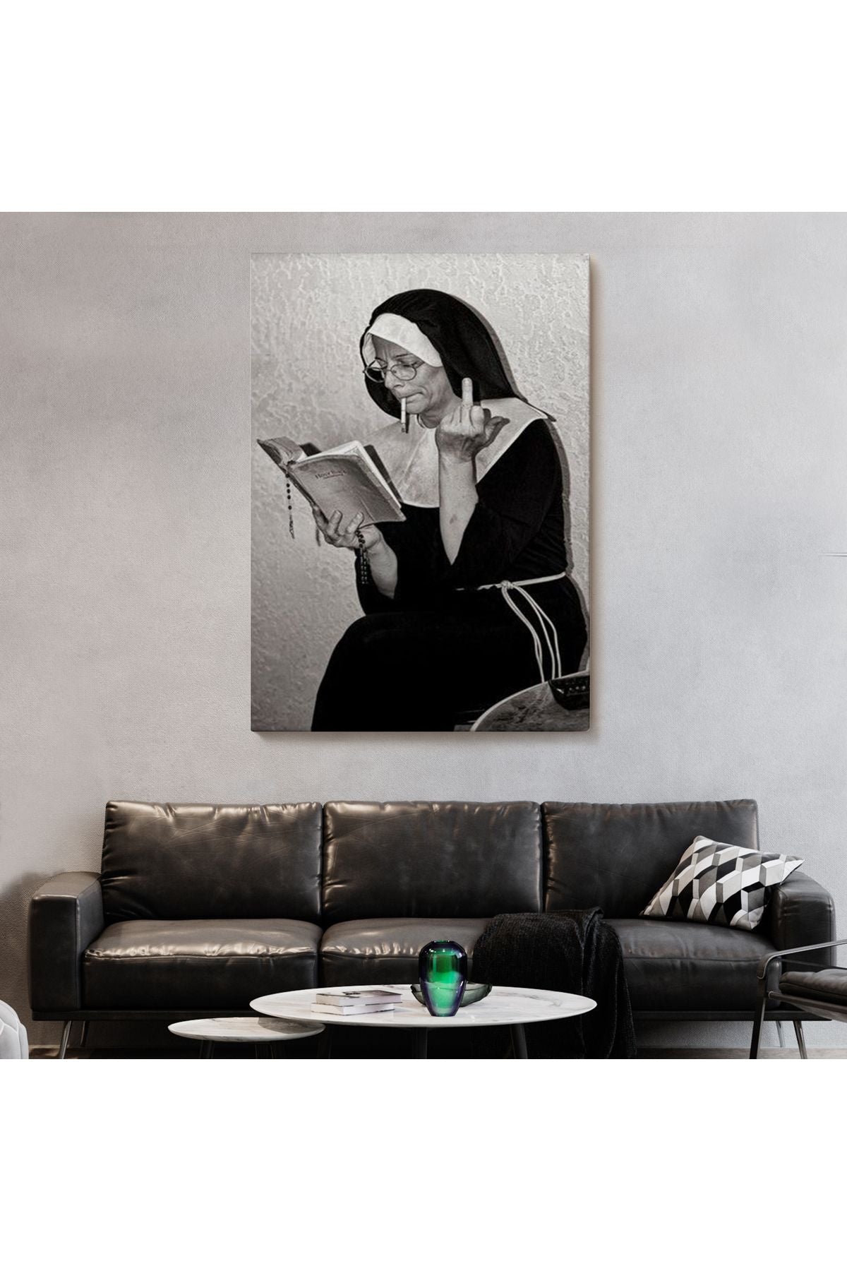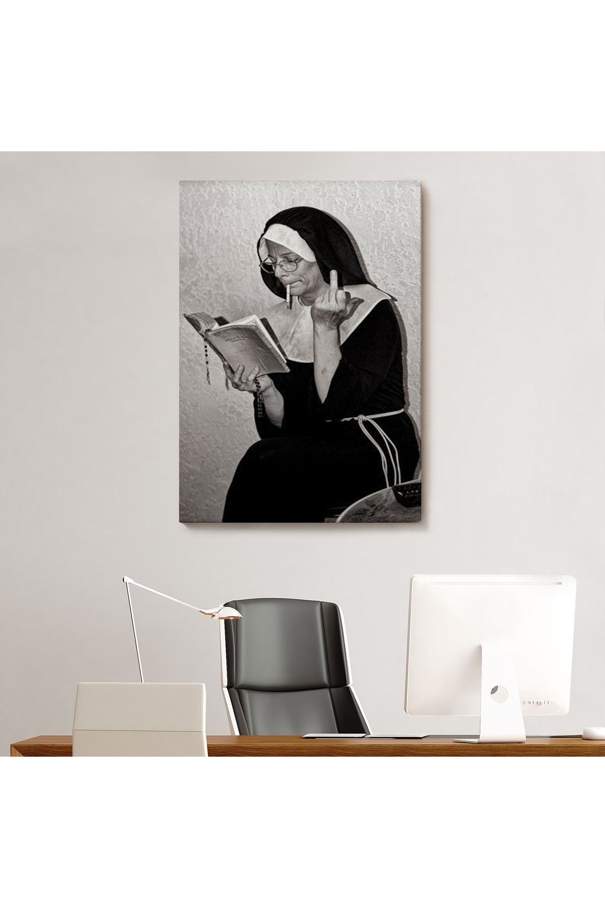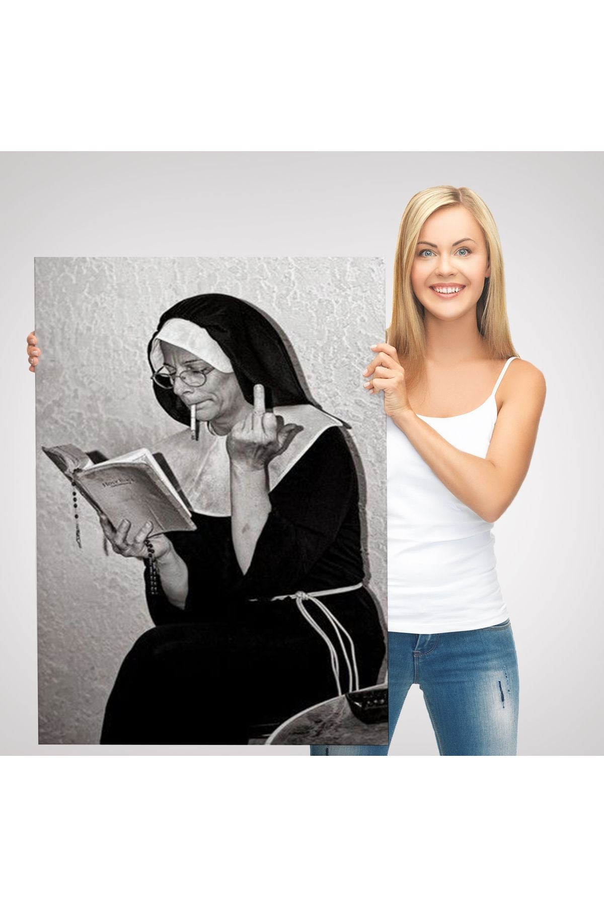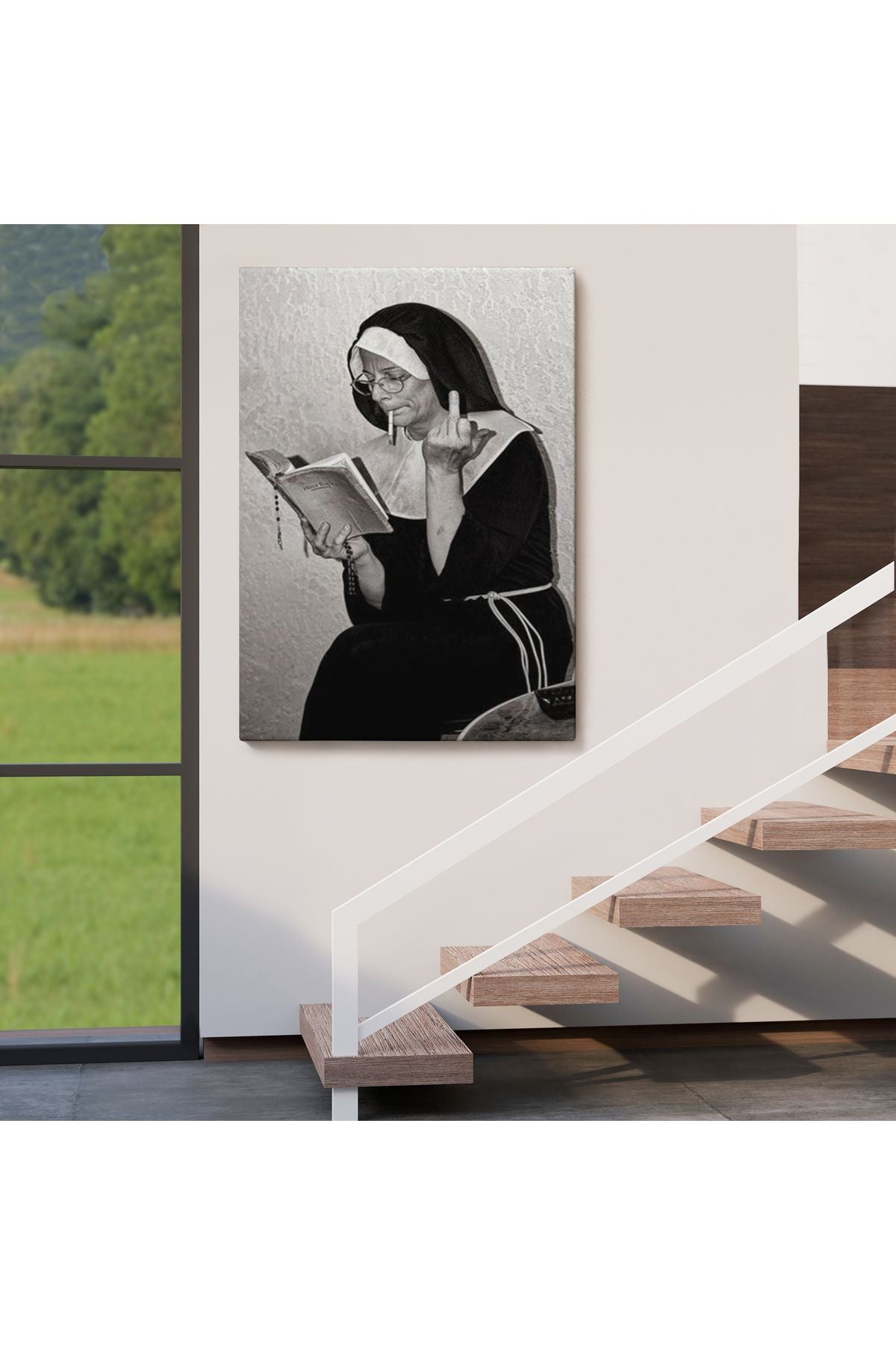 Orta Parmak İşareti Yapan Rahibe Dekoratif Duvar Tablosu-6126