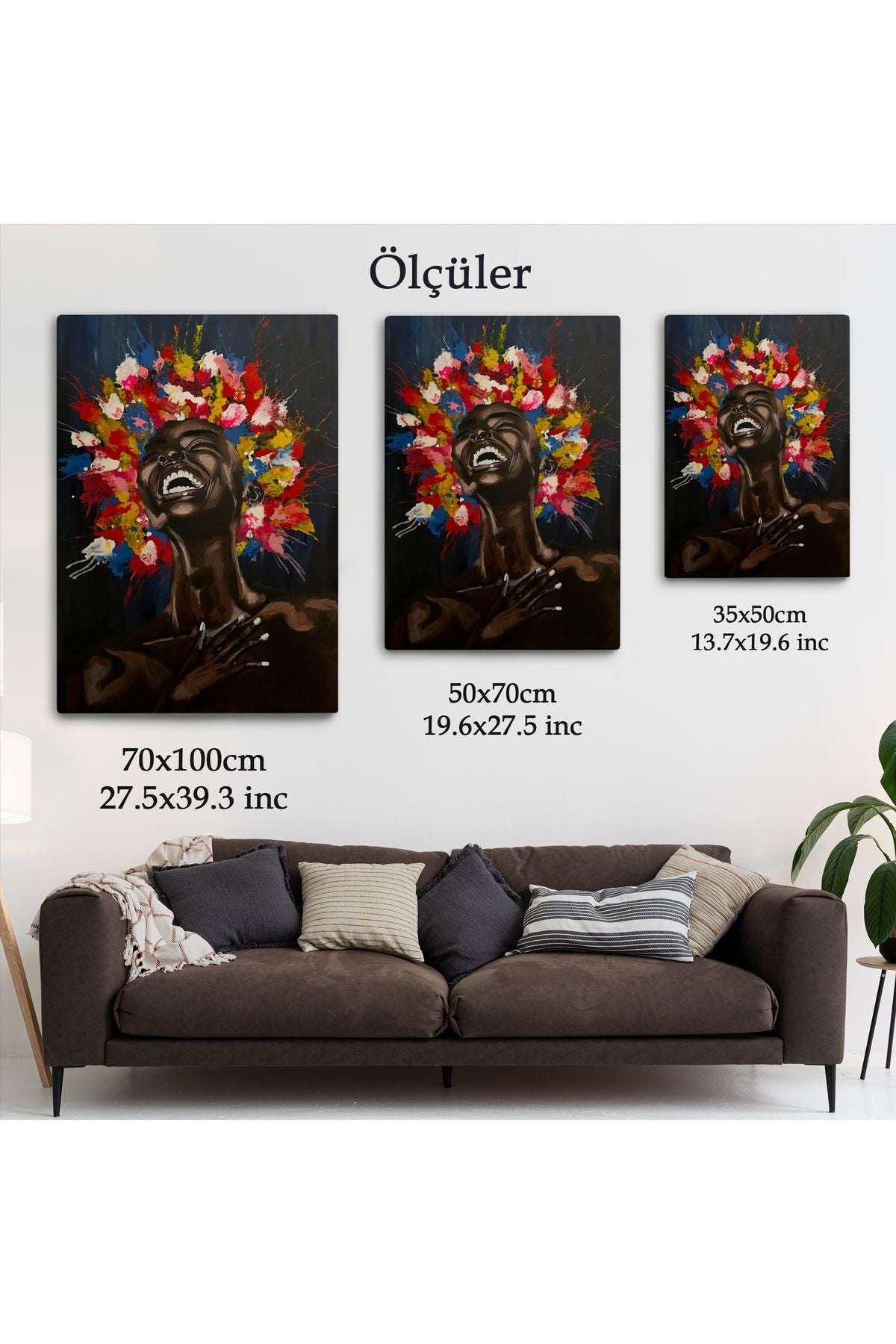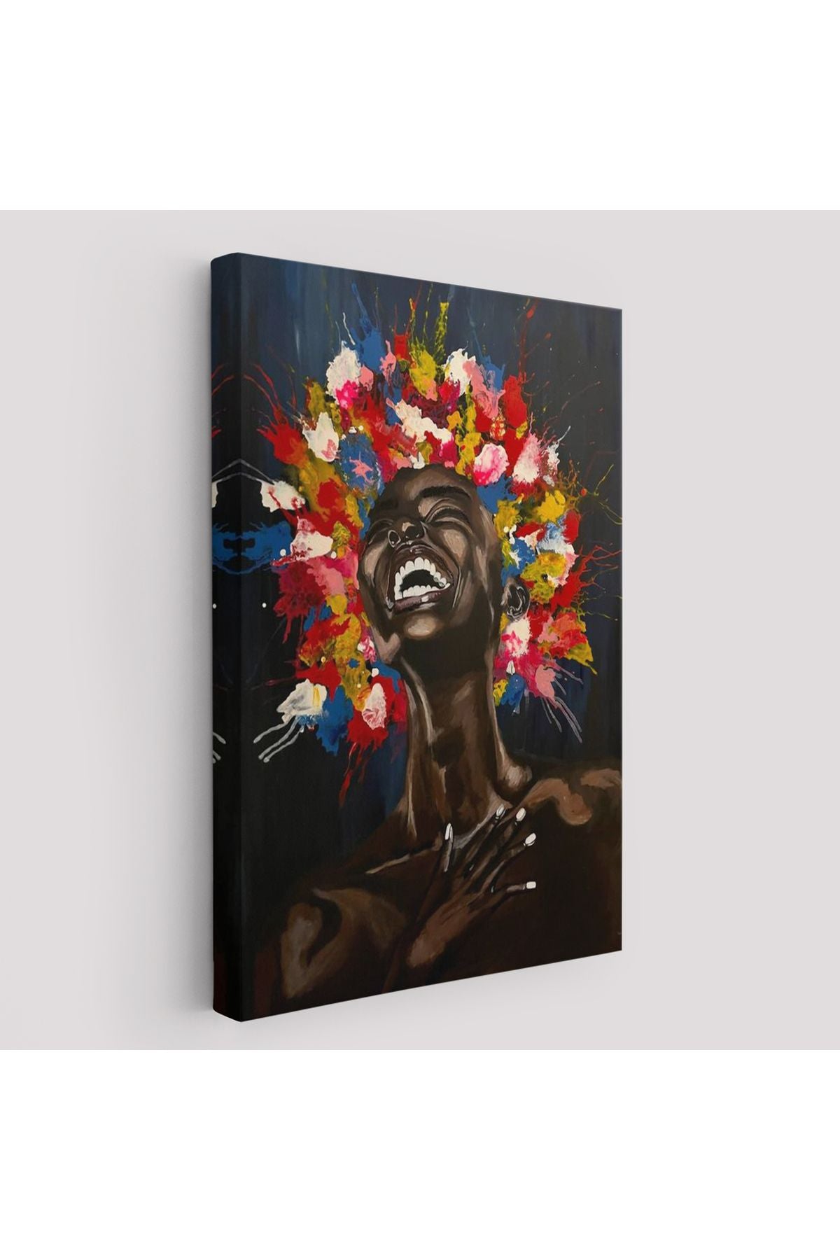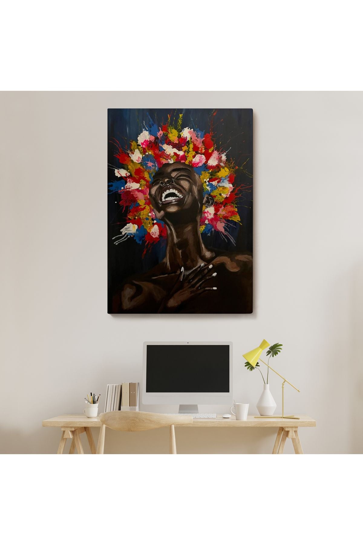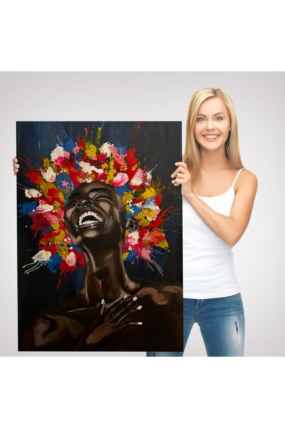 Yağlıboya Görünümlü Renkli Saçlı Gülen Siyahi Kadın Tablosu-6367